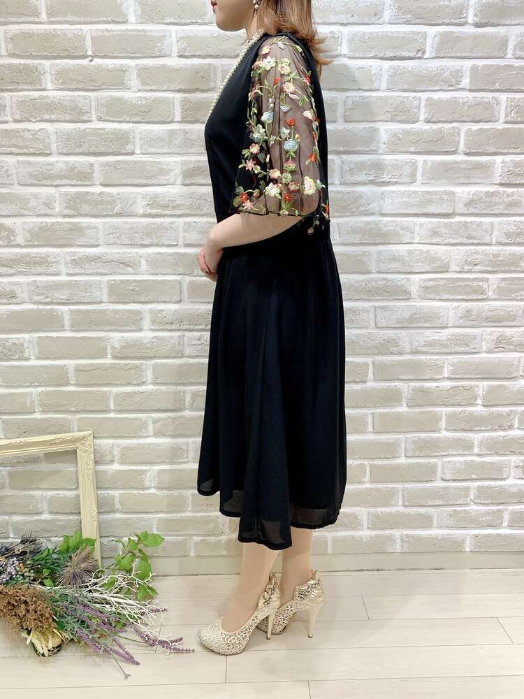 露出の控えめな五分袖のデザインとなっており、結婚式参列のゲストドレスにはもちろん、2次会のみのお呼ばれドレスやお食事会にも。落ち着きのあるイメージでドレスをお探しの方にぴったりです。ゆったりシルエットでさらっと1枚で着用でき、ナチュラルなムードに。袖はカラフルなお花の刺繍が入ったチュール生地。シンプルなデザインだと取り入れやすいですね。パール系のアクセサリーとも相性抜群。大きめサイズですが、サッシュリボンでウエストを絞ったスタイリングで普段MやLサイズ程度を着用される方にもご利用いただいています。20代のお客様に人気のドレスです。色違いで3色ご用意しております。