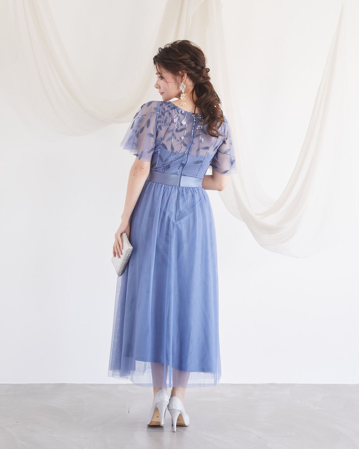くすみブルーが可愛いショートスリーブのロングドレス。全体的にチュール素材なので。ふんわりと可愛い柔らかい印象に。胸元のスパンコールのリーフ柄模様がおしゃれです。演奏会、パーティー、様々なシーンでご利用頂けます。