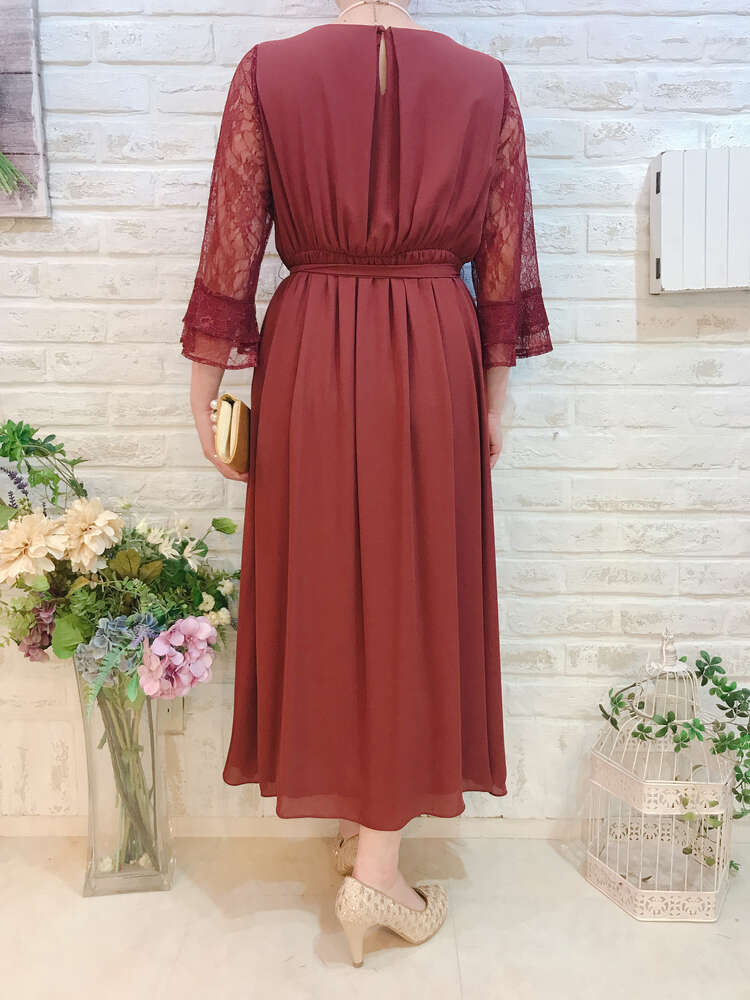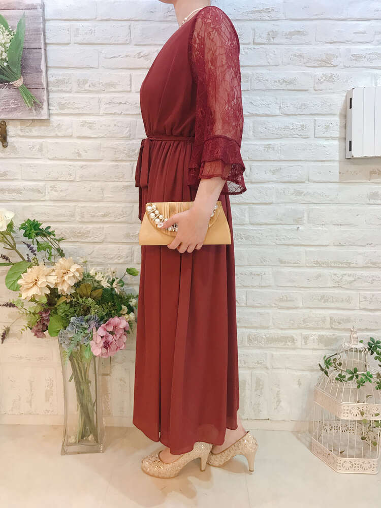 ゲスト様におすすめなレンガカラー袖レース丈長めドレス
