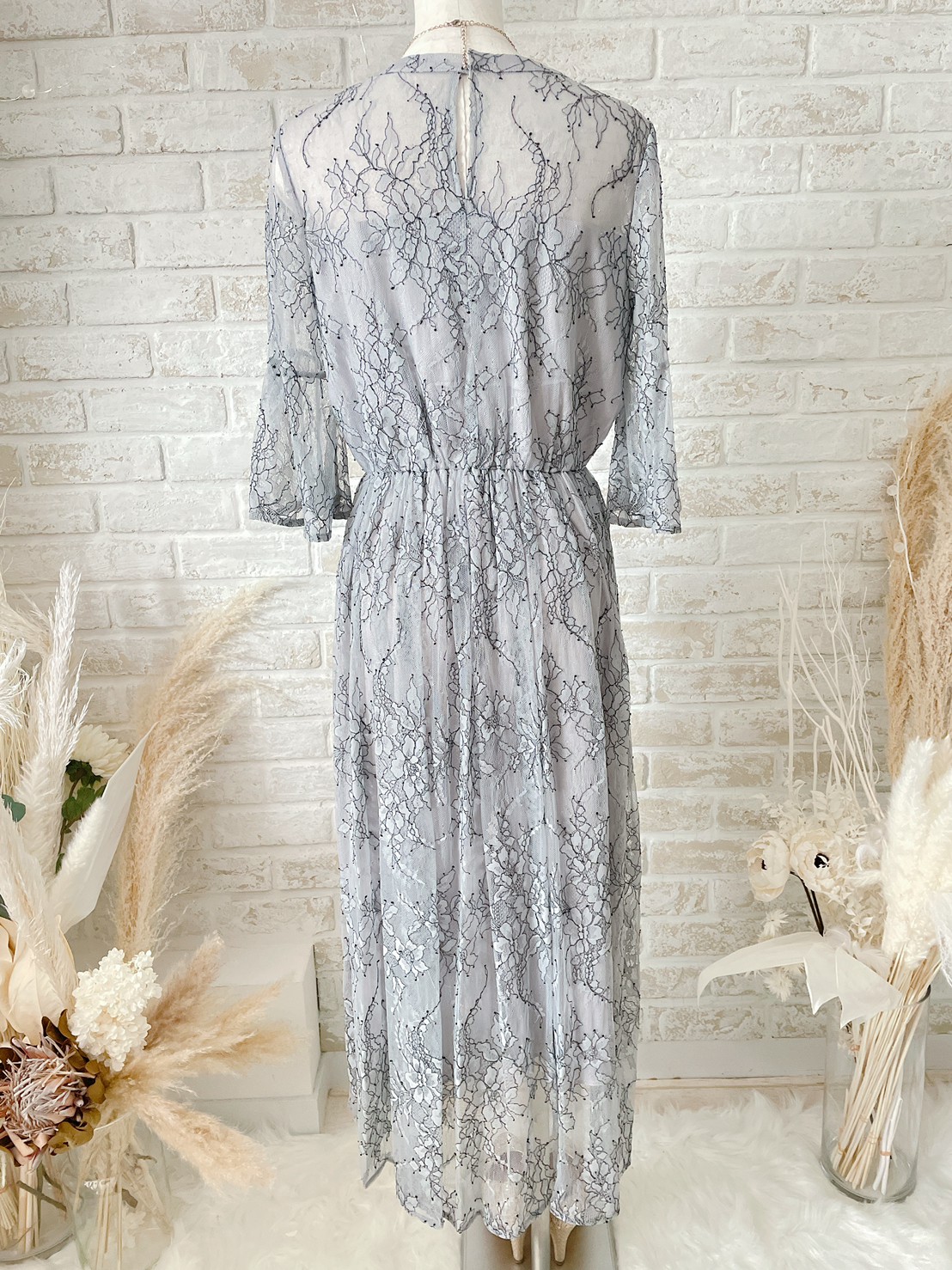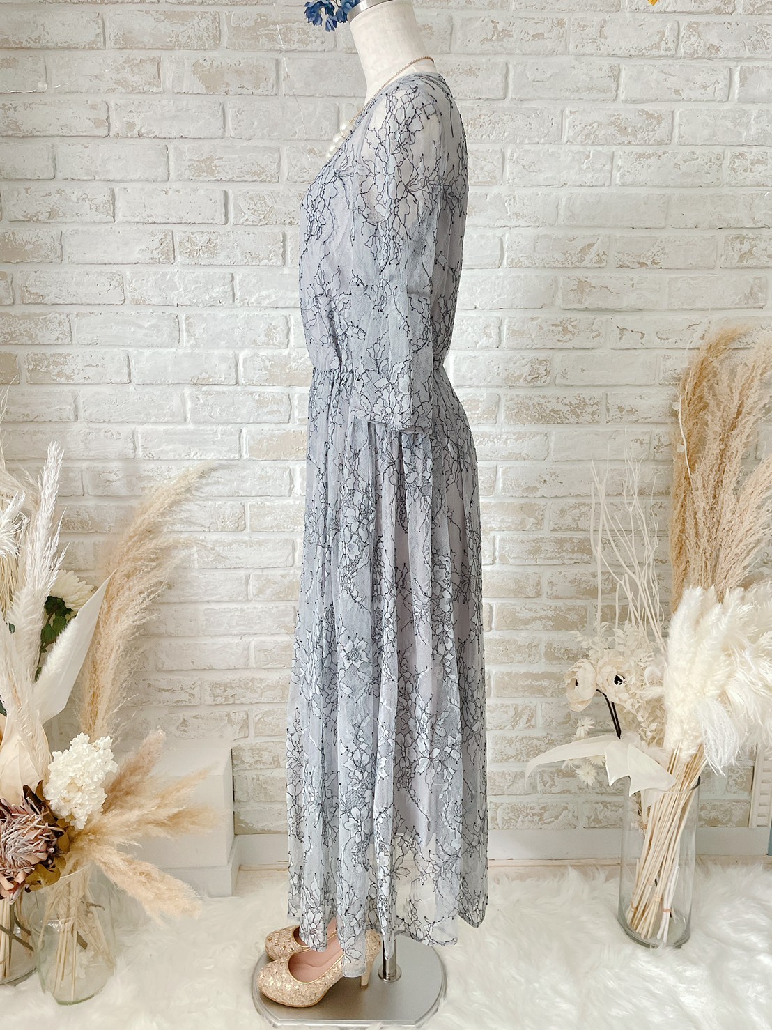 ★グレーブルー・レース花柄ミモレ丈ドレス(ネックレス×)