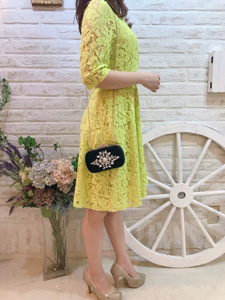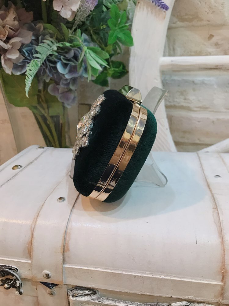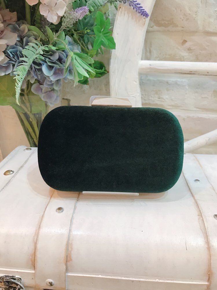 ダークグリーンのミニクラッチバッグ。 ベロア素材にビジューのデザインがあしらわれていて、大変華やかです。鞄の開き部分はゴールドになっています。チェーン付きの2way仕様なので、利用シーンによって持ち方を替えられるのも嬉しいポイントです。袱紗が入る大きさで、収納力もあり抜群の機能性。