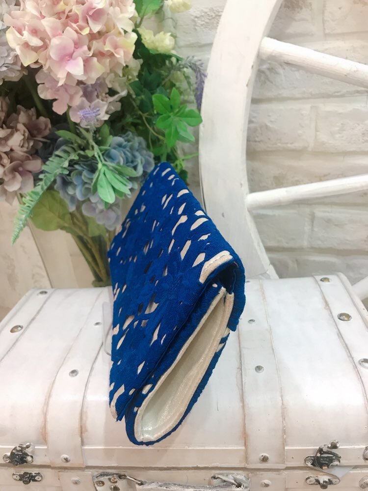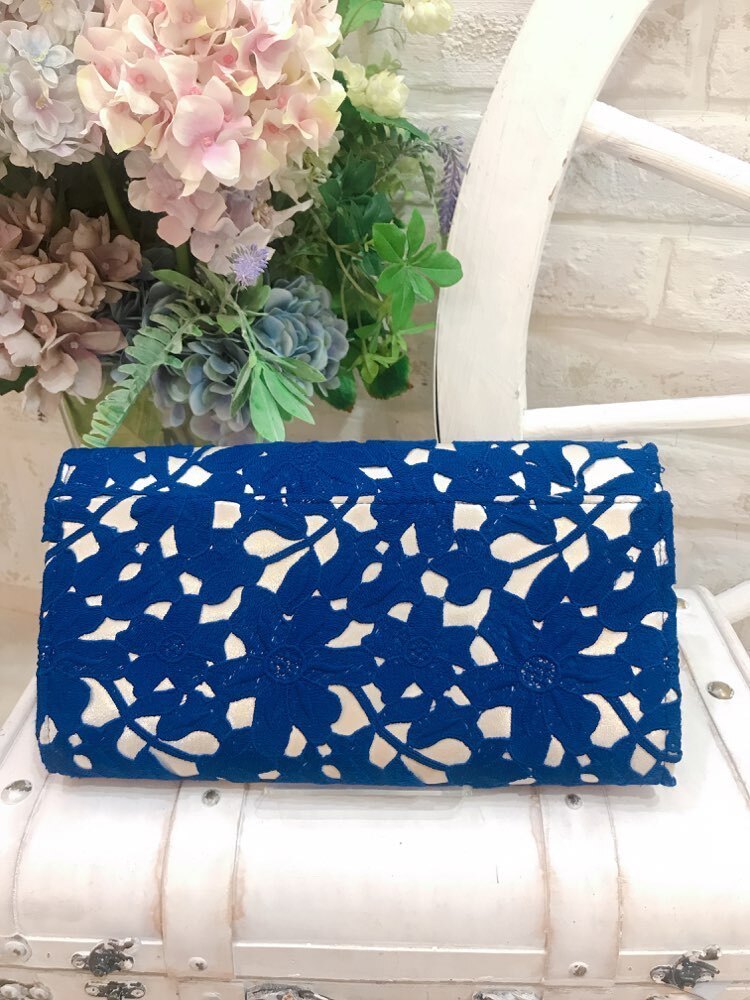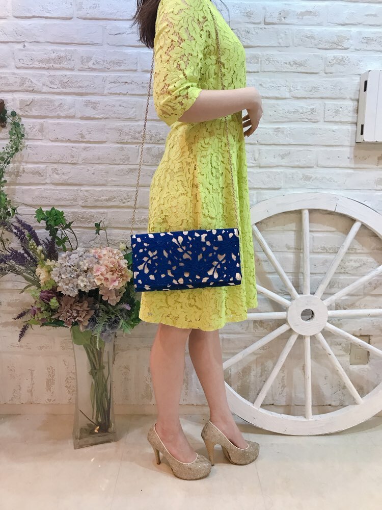 人気レンタルはブルーのレース柄クラッチバッグ
