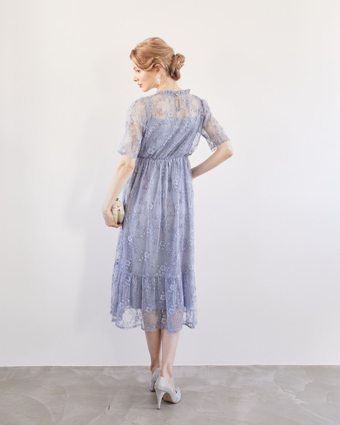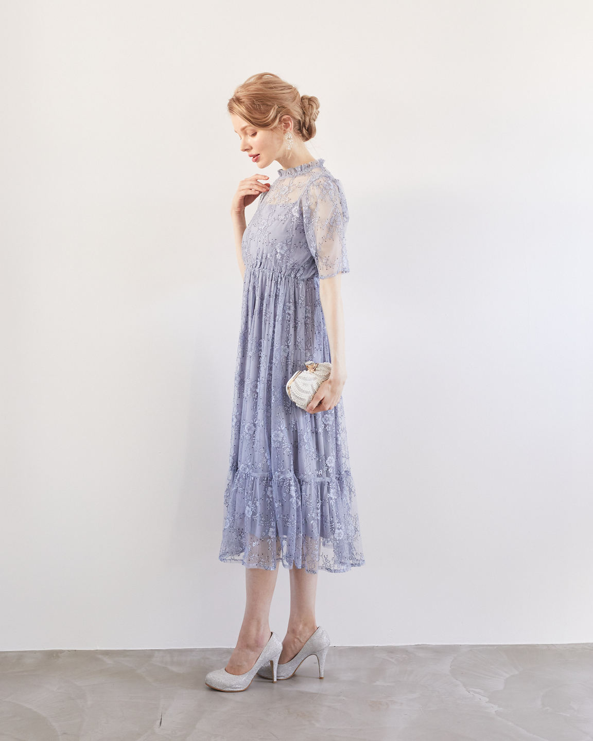 ライトブルー 半袖総レース 可愛い 同窓会ドレス ゲストドレス レンタル 安い