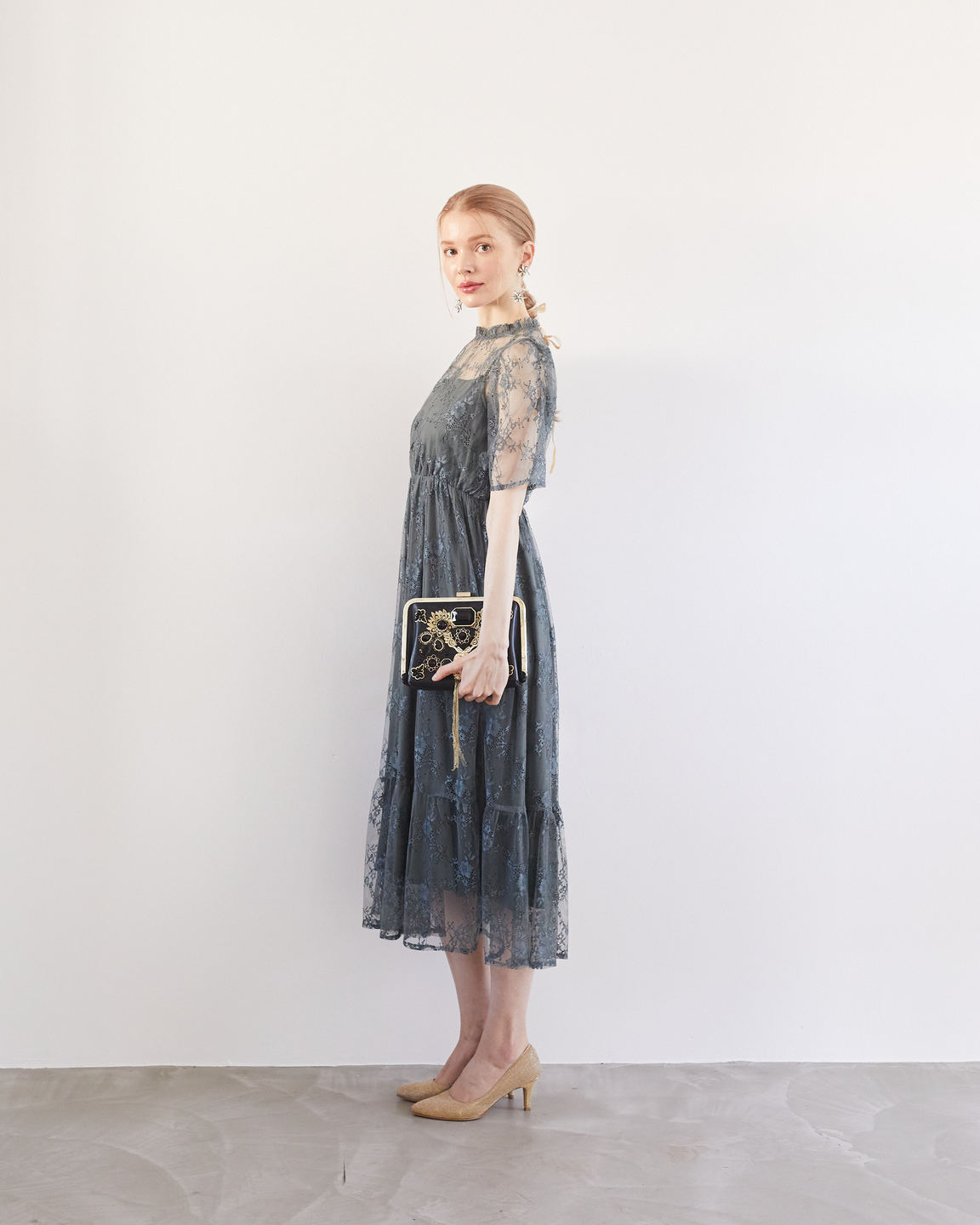 スモークダークグリーン ゲストドレス 半袖総レース レンタル