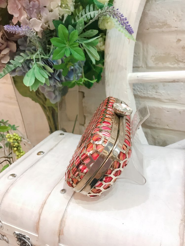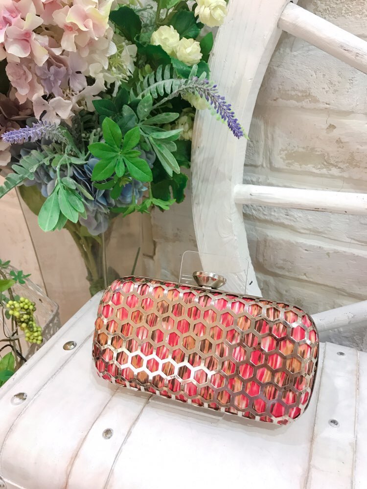 ゴールドの網目模様のミニクラッチバッグ。網目の下地にはピンクとオレンジの斑柄となっています。チェーン付きの2way仕様なので、利用シーンによって持ち方を替えられるのも嬉しいポイントです。結婚式や二次会、各種パーティなど華やかな場面にぴったりなバッグです。
