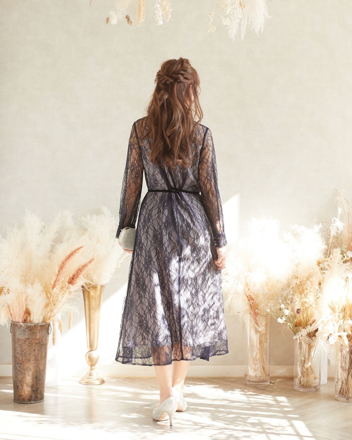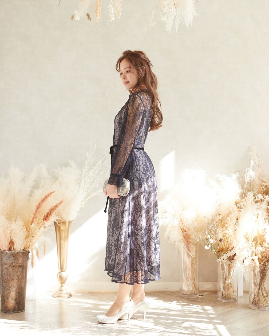 東京レンタル 安い ゲストドレス ネイビー 長袖 総レース 華やか