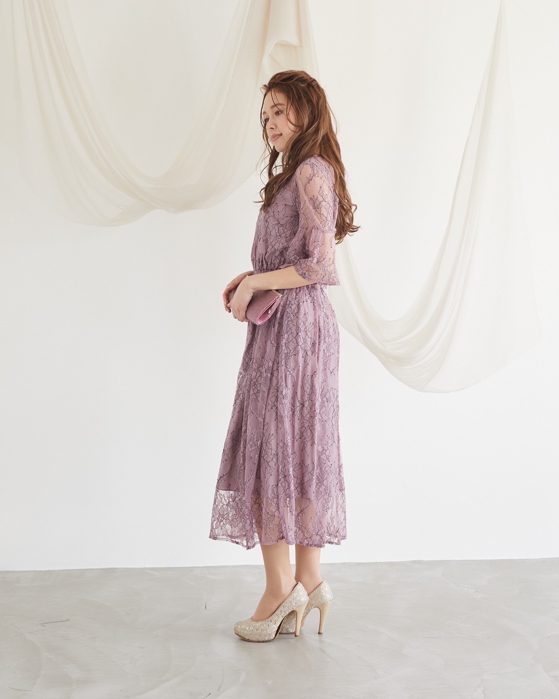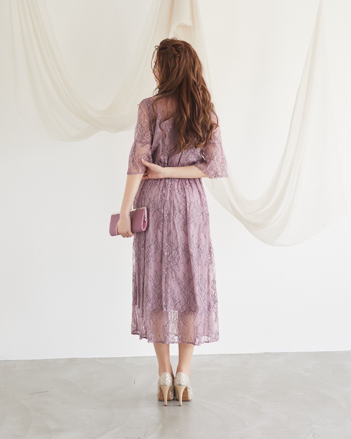 【ゲストドレス】ダスティピンク レース柄 七分丈スリーブ M