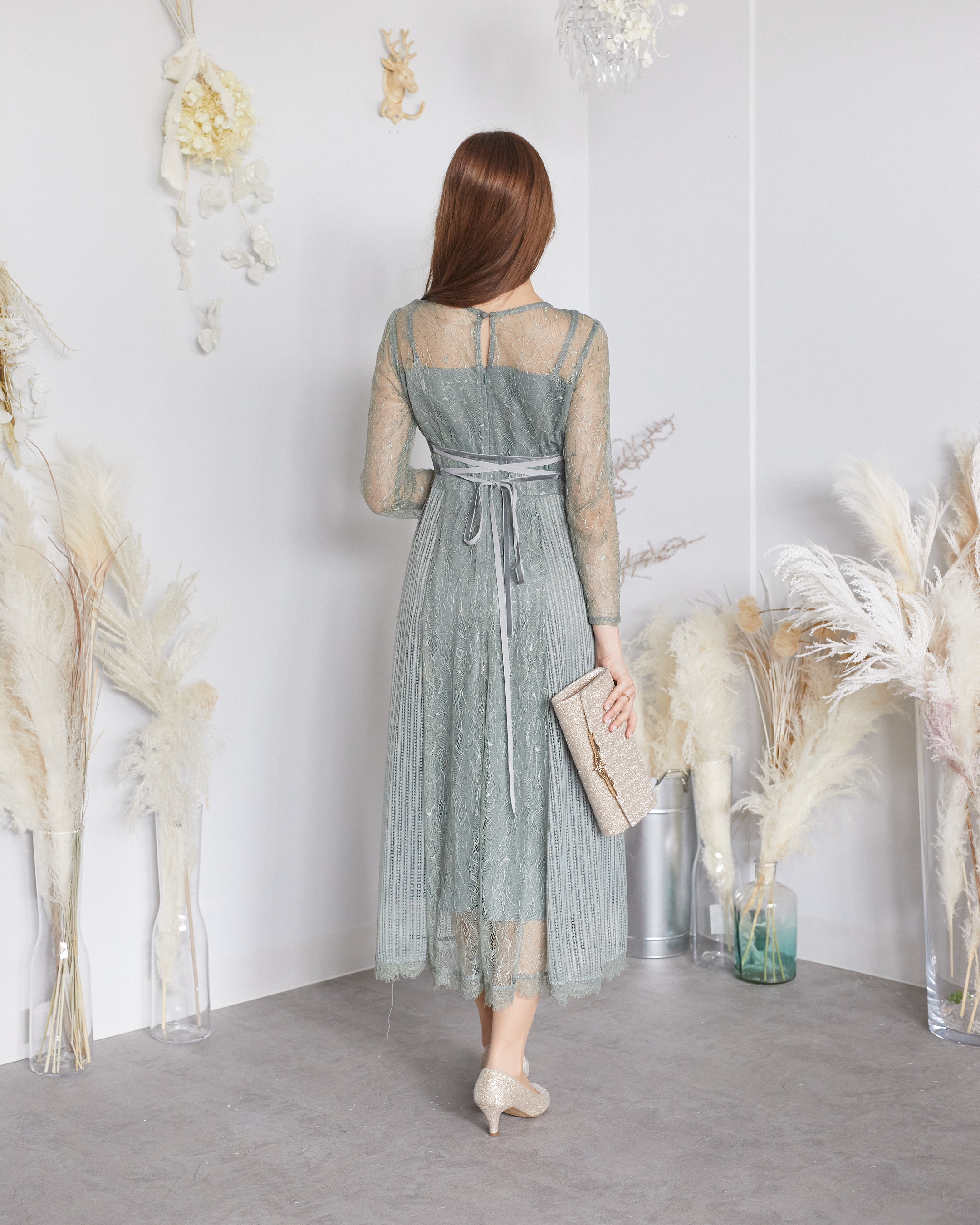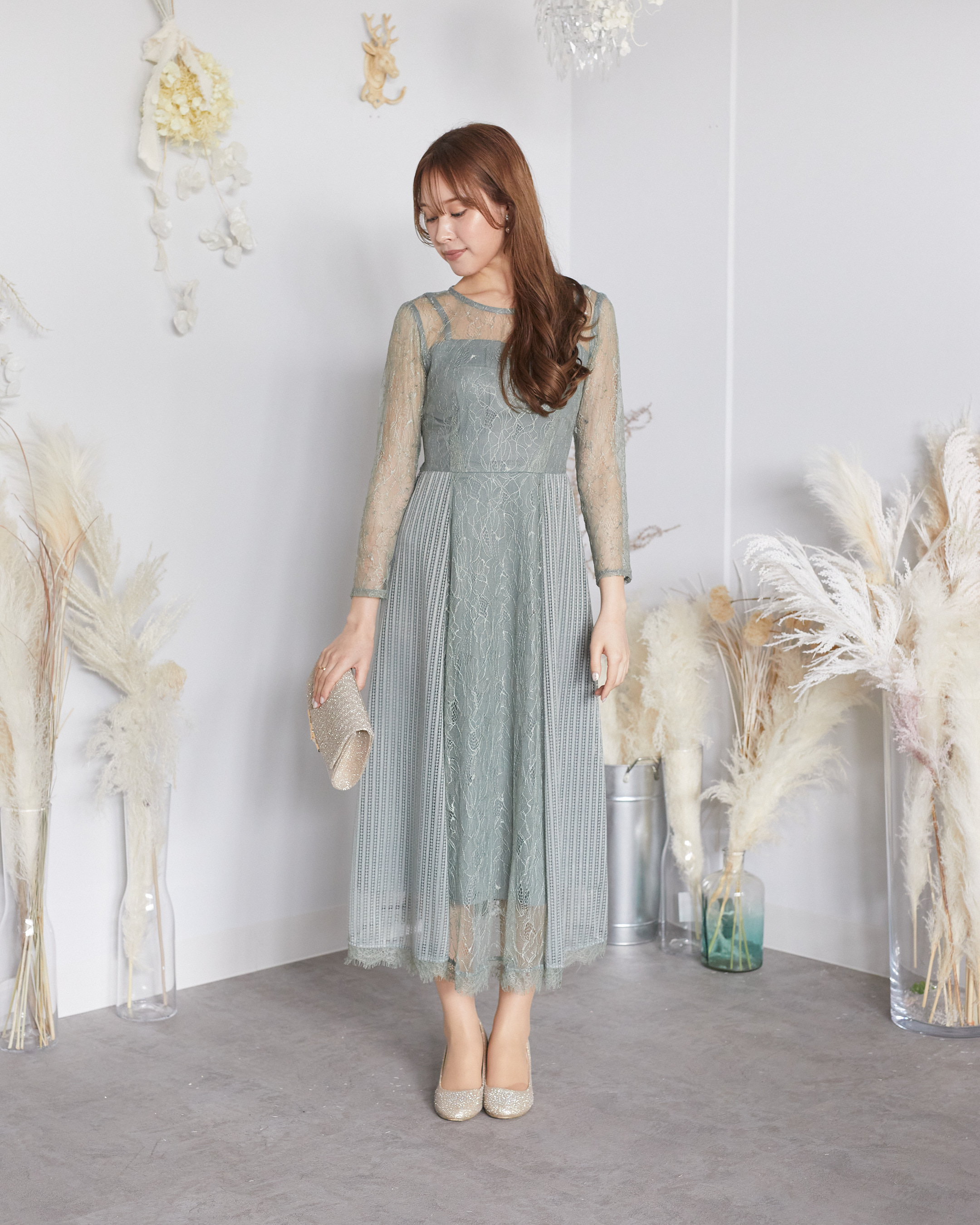 くすみグリーン ロングスリーブ 総レース ゲストドレス レンタル 安い