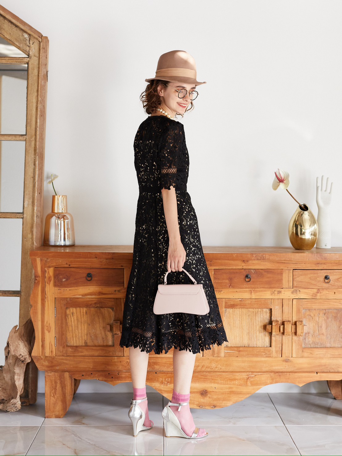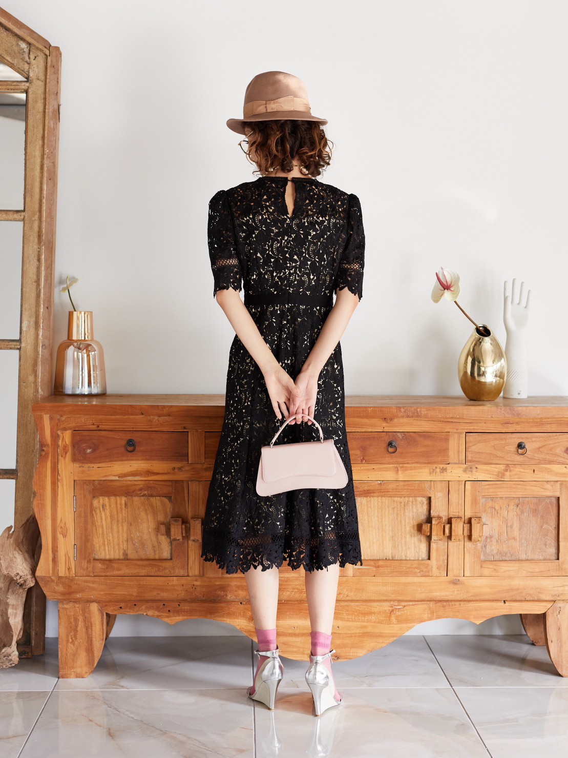 【パーティードレス】CELFORD ブラックレース5分丈スリーブドレス S-M