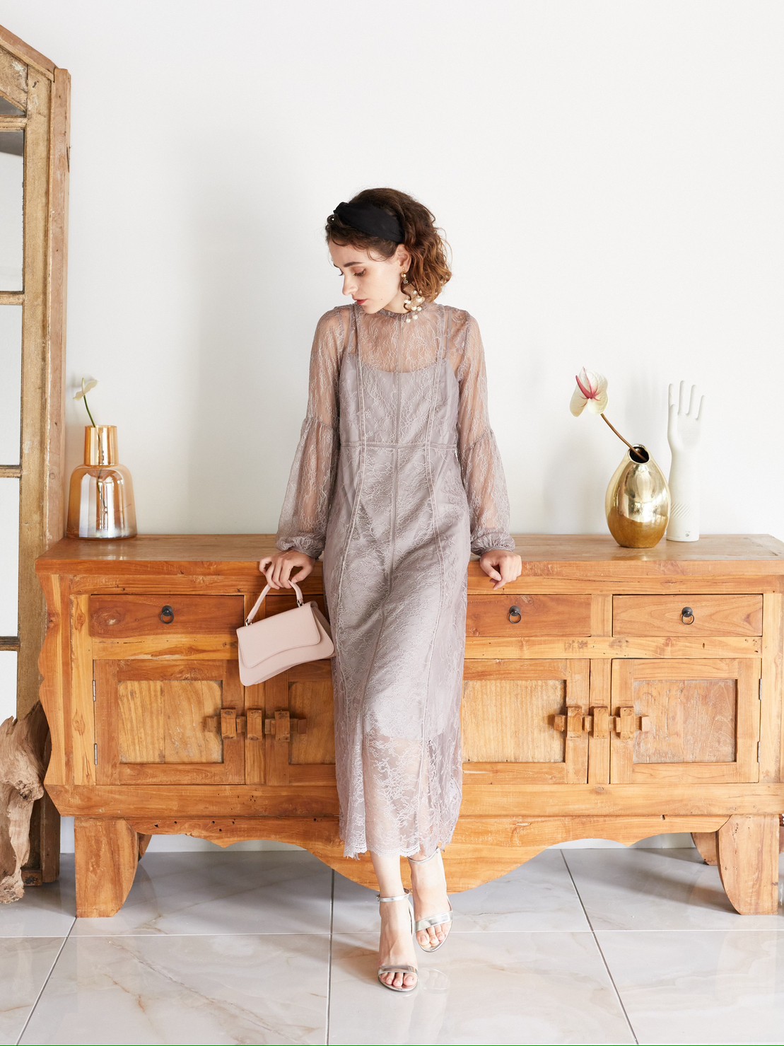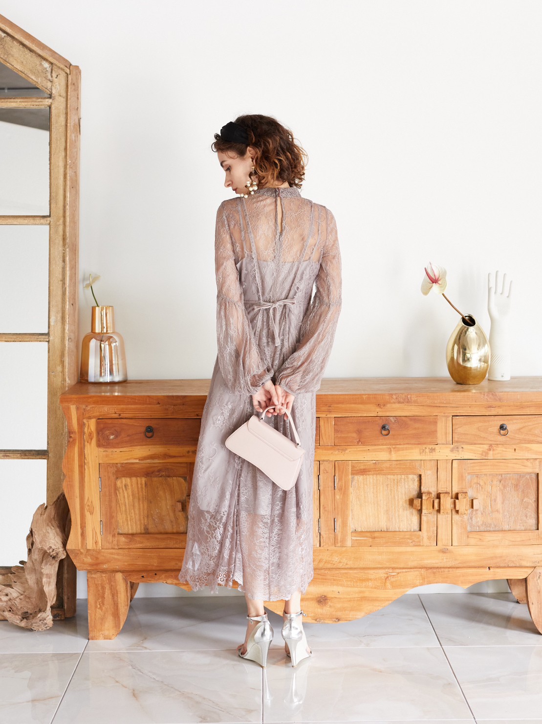 FRAY I.Dドレス フレイアイディードレス 表参道レンタルドレス パーティードレスも スモーキーパープルカラー総レースドルマンスリーブドレス S-M