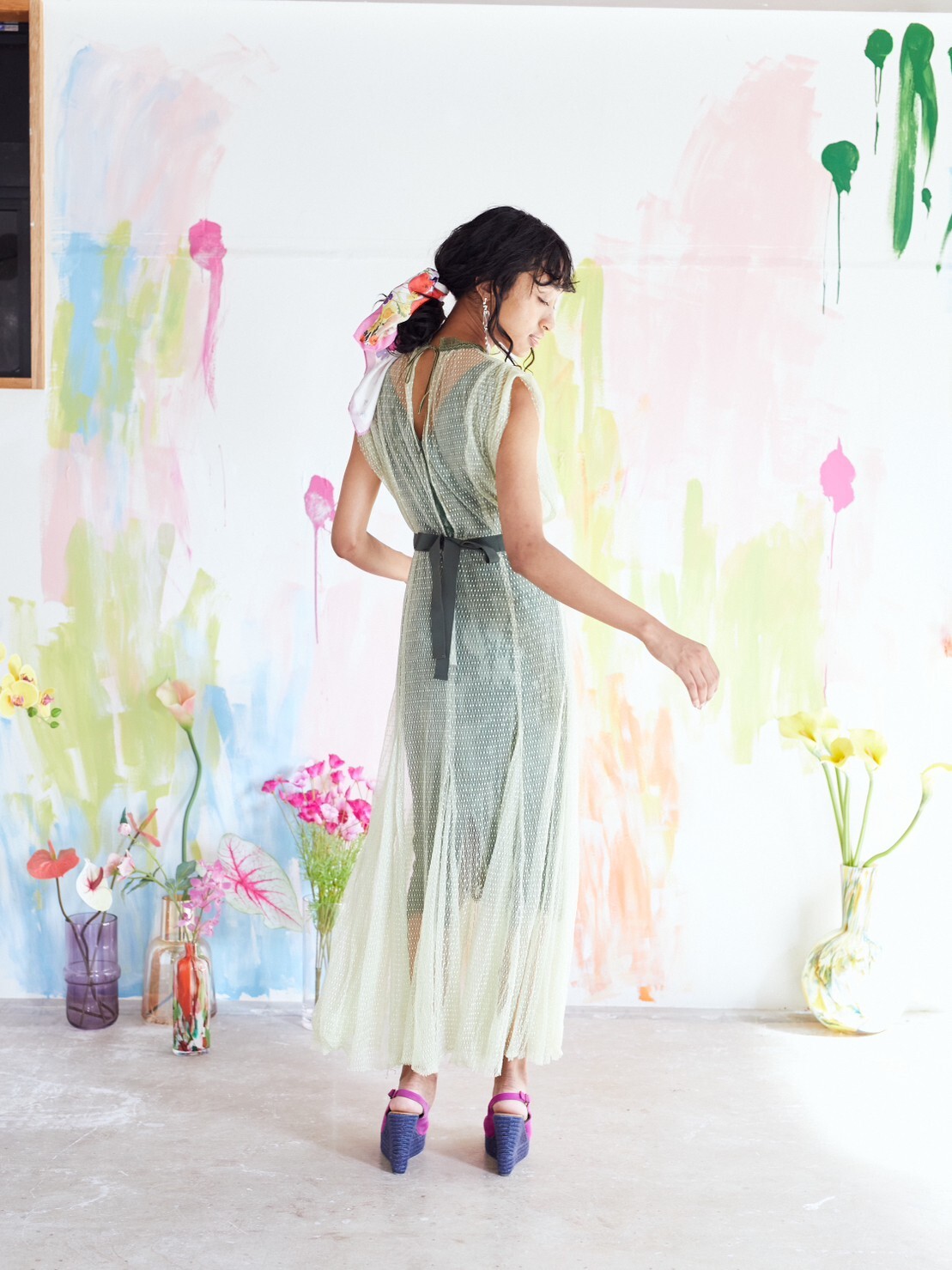 snidel ゲストドレス パーティードレス 結婚式参列 お呼ばれドレス ライムグリーン 総レースドレスドットチュールオーバードレス