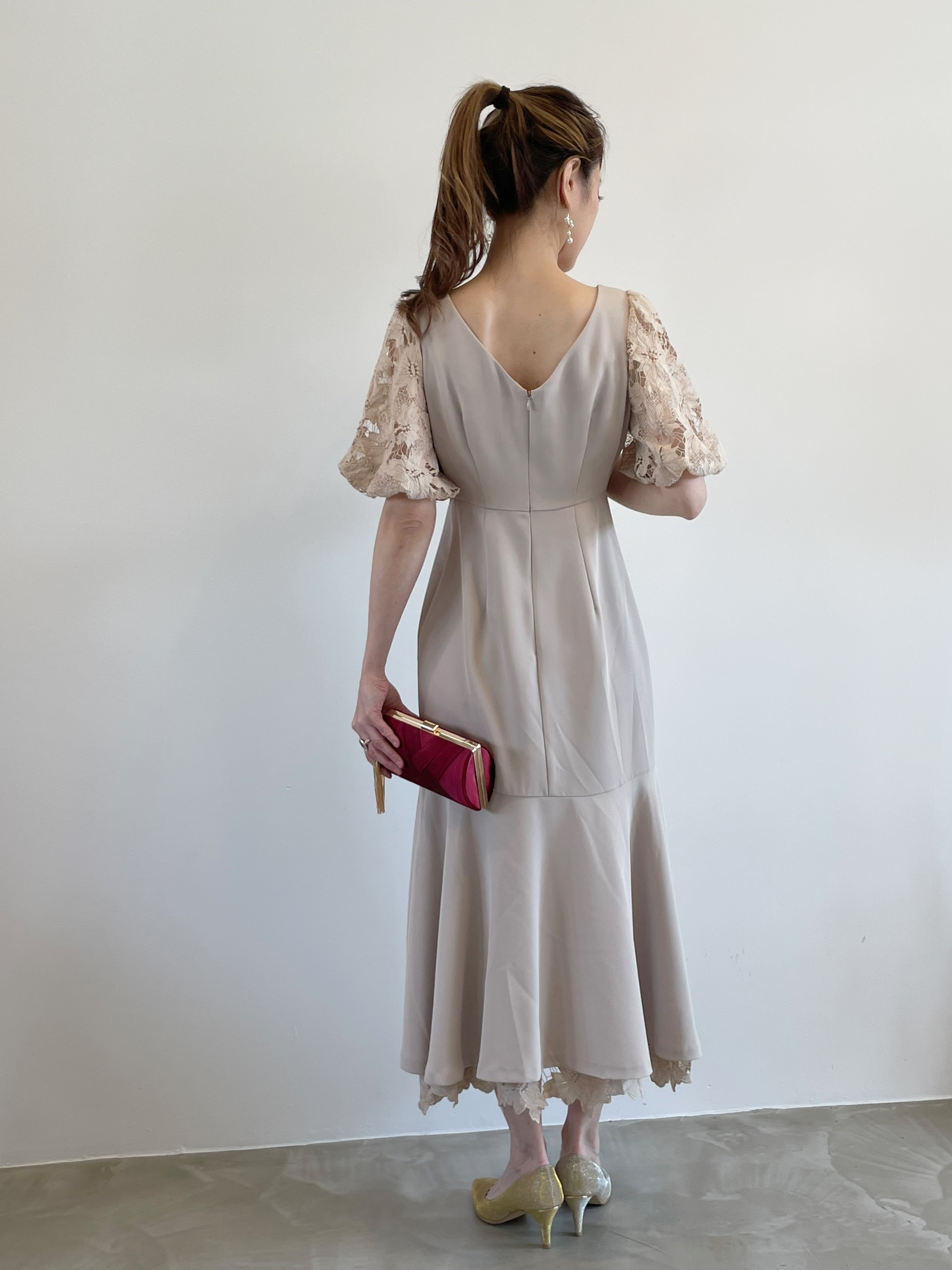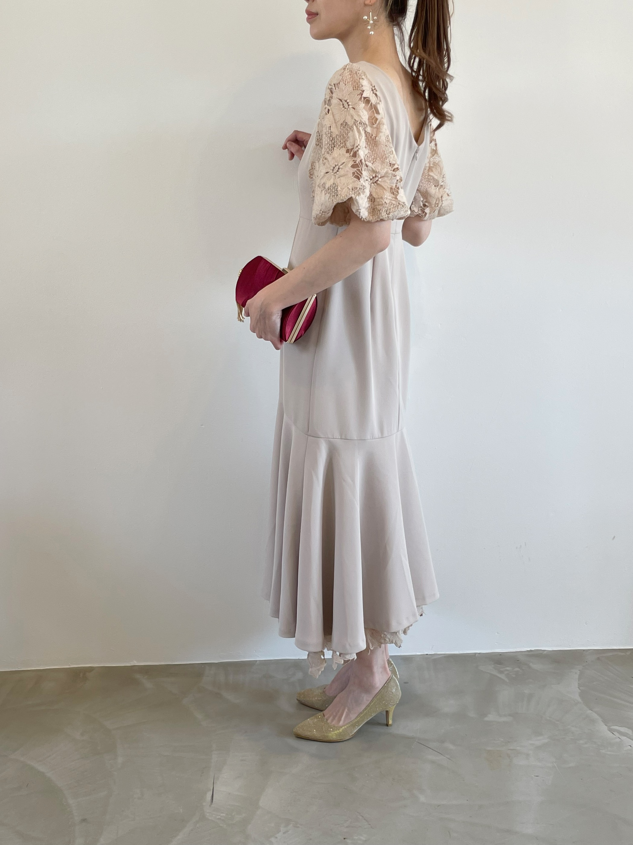 【ゲストドレス】ベージュ 袖レース ソフトマーメイド M