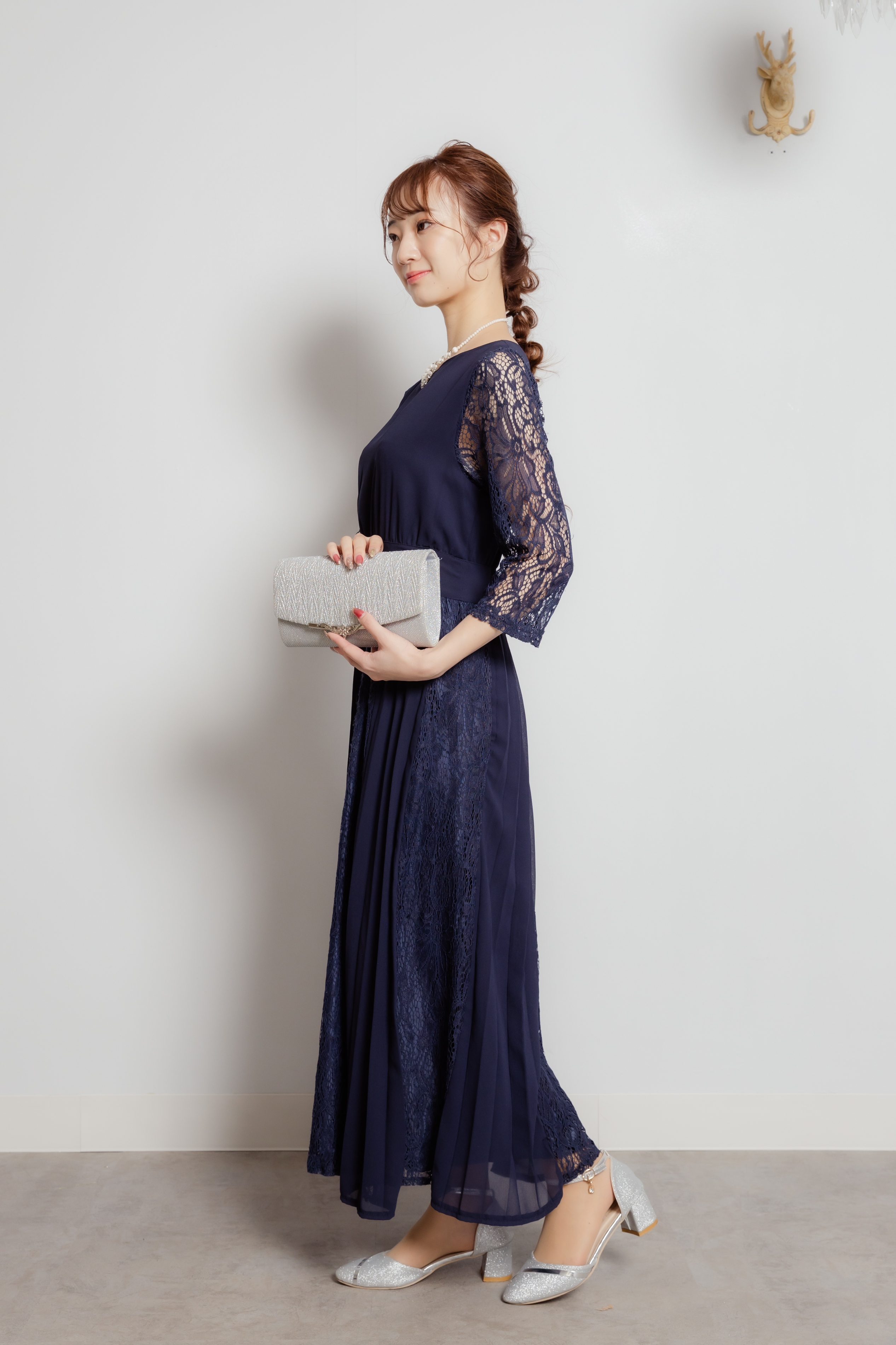 ネイビー袖レース×プリーツスカート切替ドレス2L