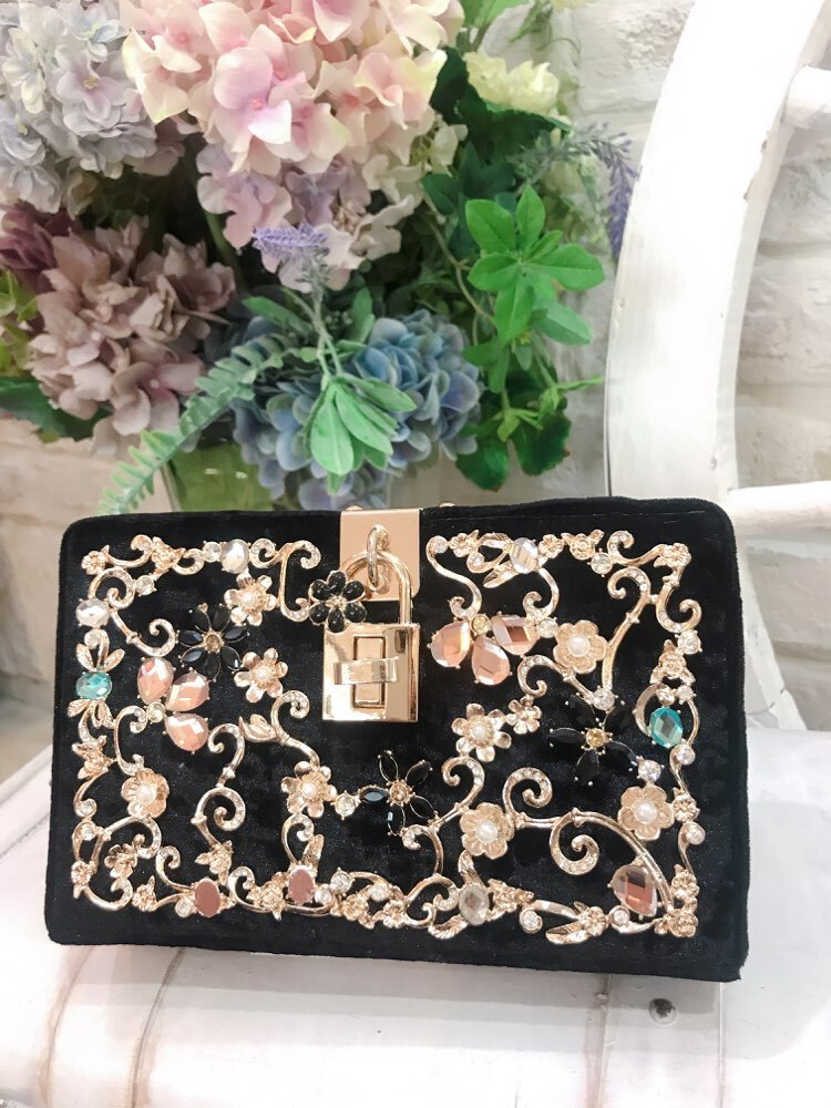 ブラッククラッチバッグ。ベロア素材にゴールドのペイズリー柄のモチーフとカラフルなビジューがデザインがされています。バッグの開け口には鍵型のバックルがついていて大変可愛いバッグとなっています。チェーン付きの2way仕様なので、利用シーンによって持ち方を替えられるのも嬉しいポイントです。結婚式や二次会、各種パーティなど華やかな場面にぴったりなバッグです。