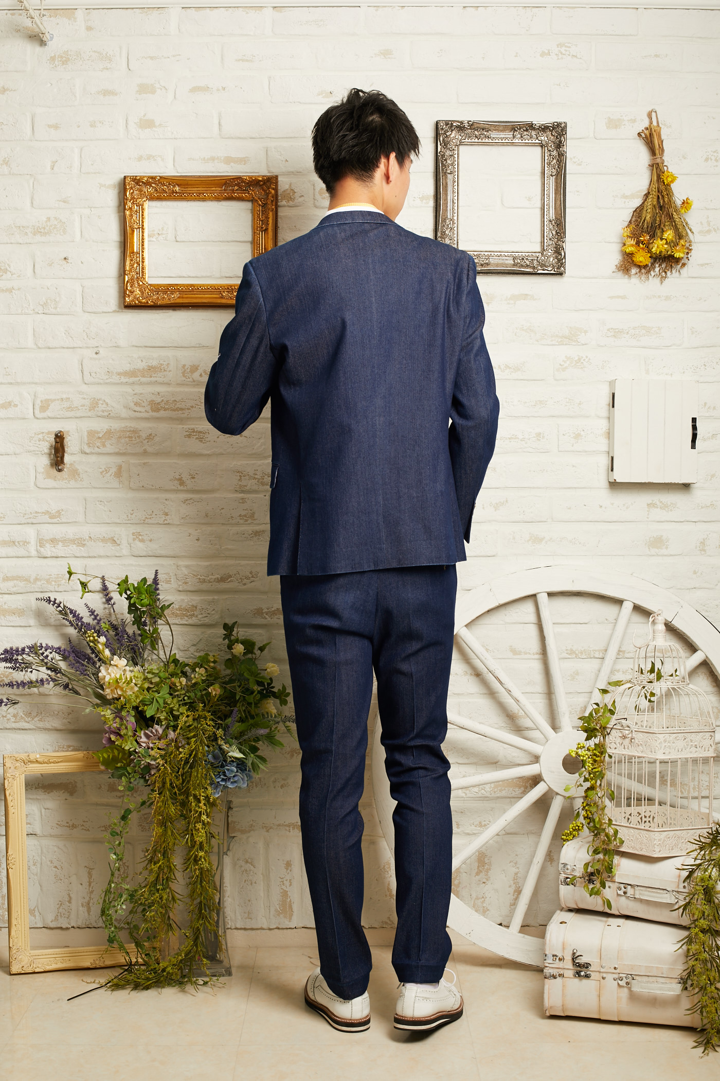 デニム素材のインディゴカラーのパンツ。普段Sサイズの方におすすめです。シャツやタイなどお小物の柄・カラーを選ばず着ていただけるので、小物合わせが楽しく、合わせ方次第で個性が出せる1着です。カジュアルパーティーや結婚式2次会、ガーデンウェディング、前撮りなど幅広くお使い頂けます。セットのベスト、ジャケットと合わせてお使いいただく事をおすすめします。