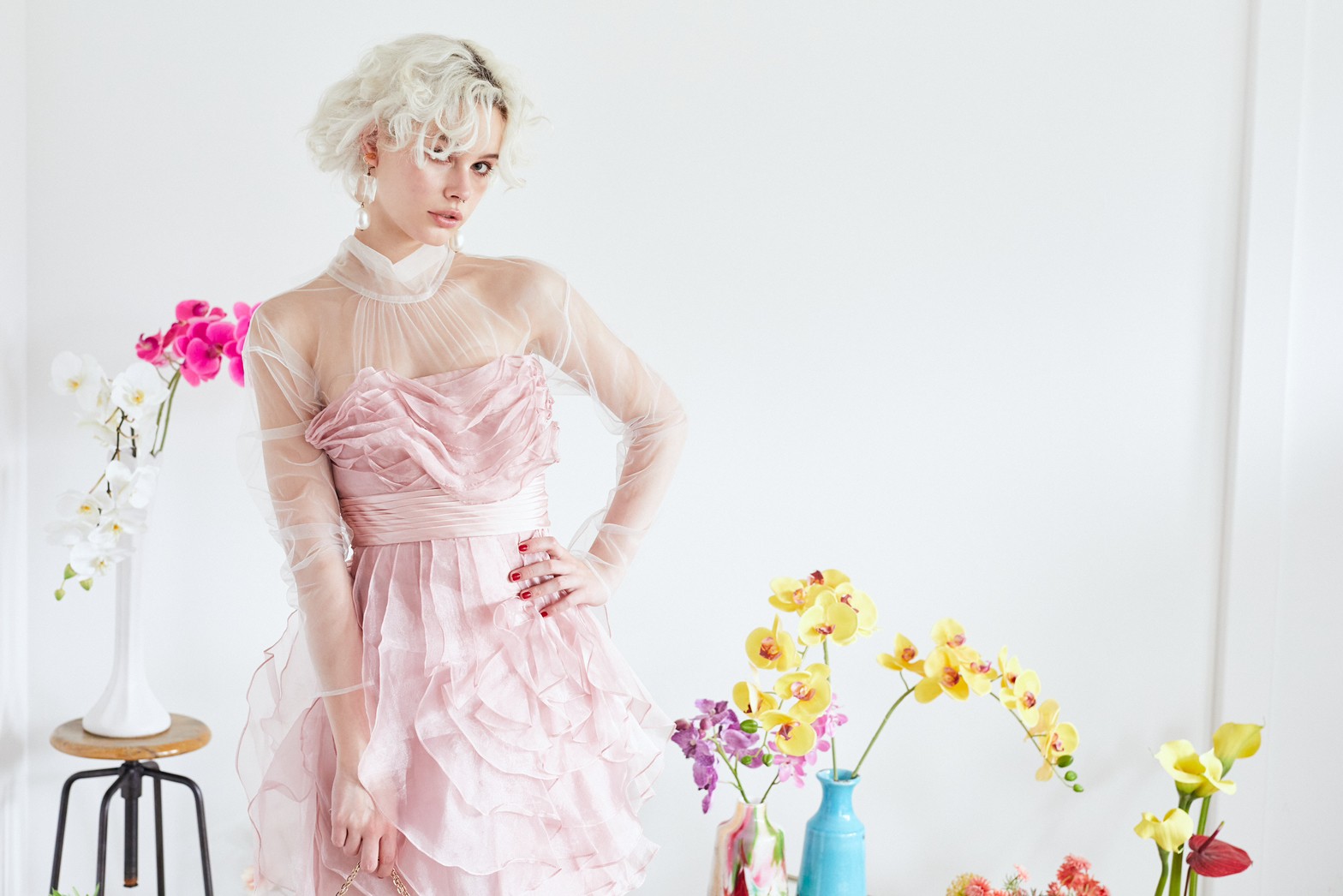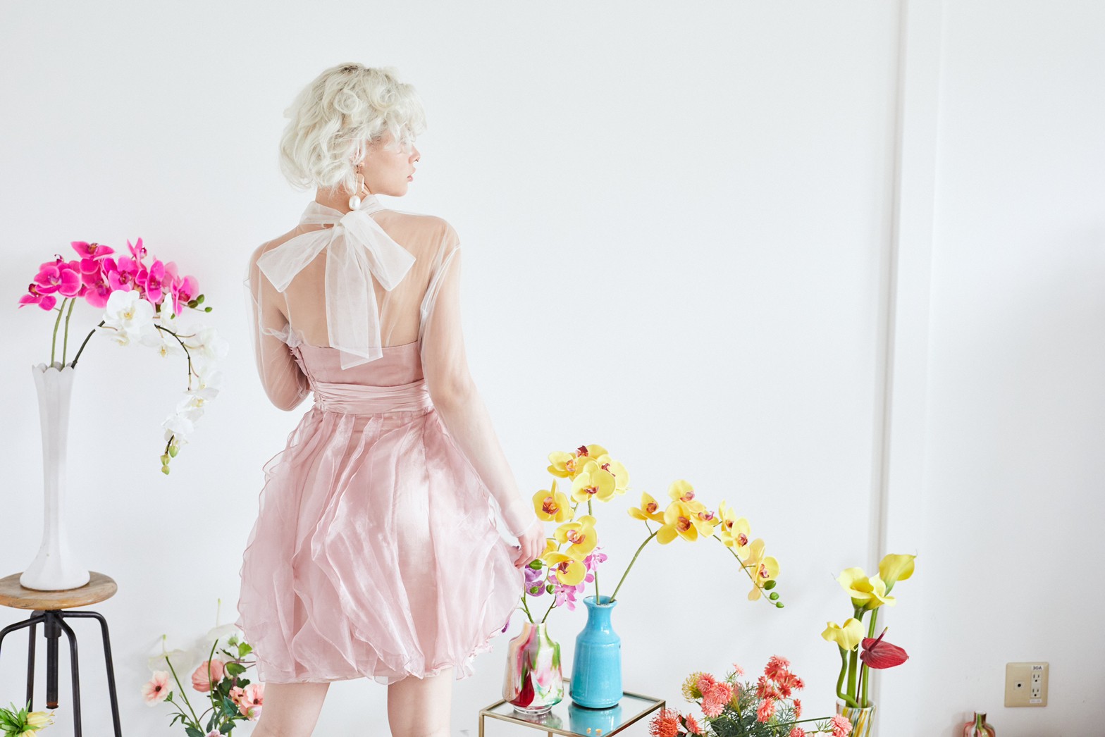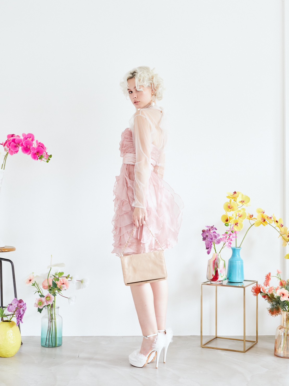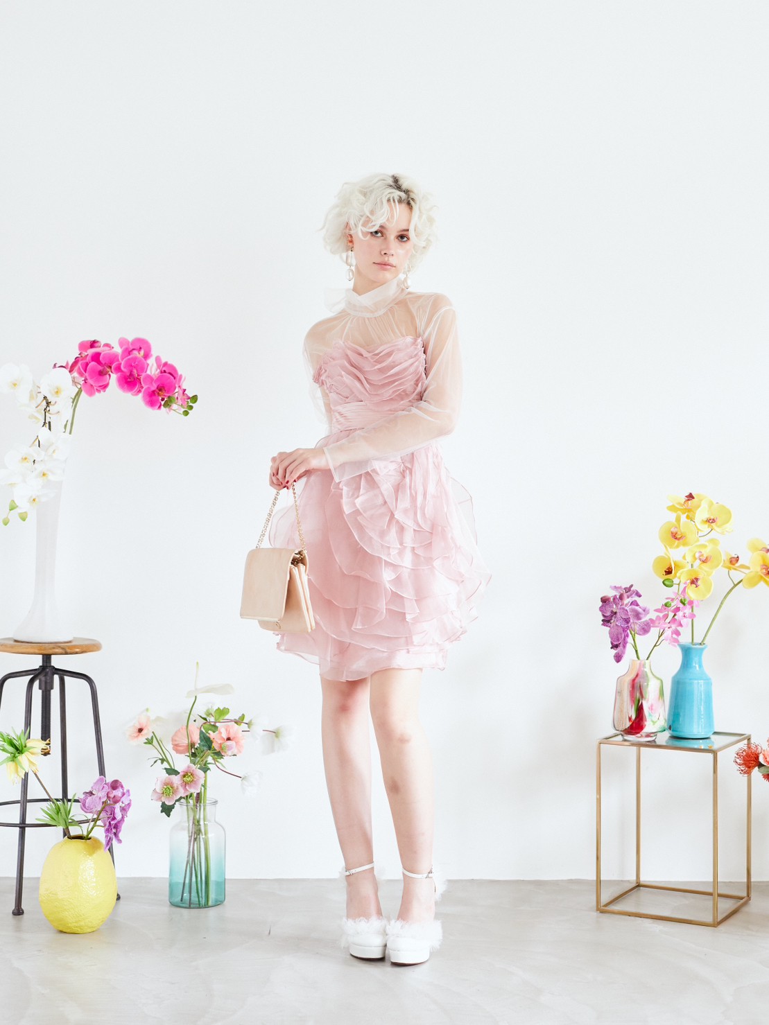 【パーティードレス】ベビーピンクひらひら花びらベアドレス