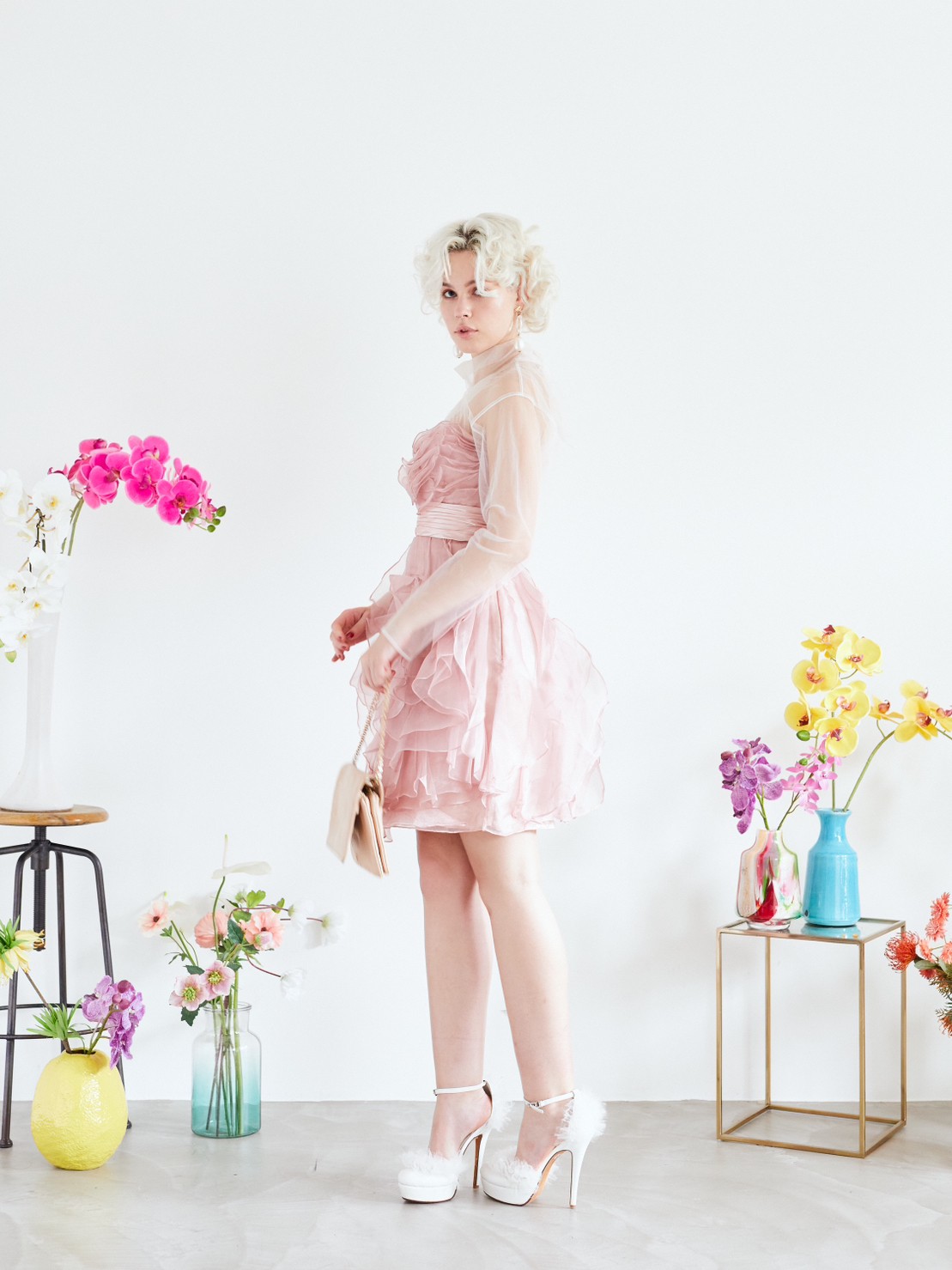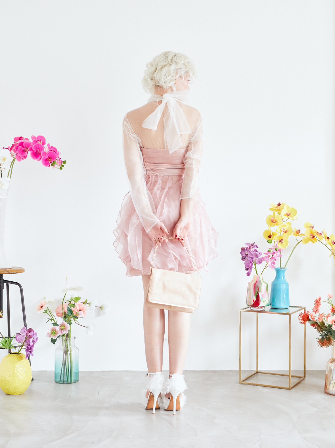 ベビーピンクのベアドレス。スカート部分が全体的に花びらの様なデザインでひらひらしていてとても可愛いドレスです。ブルーや水色、グリーン等寒色系の小物も相性が良いですし、同系色のピンクで合わせるとより一層甘いコーディネートになります。