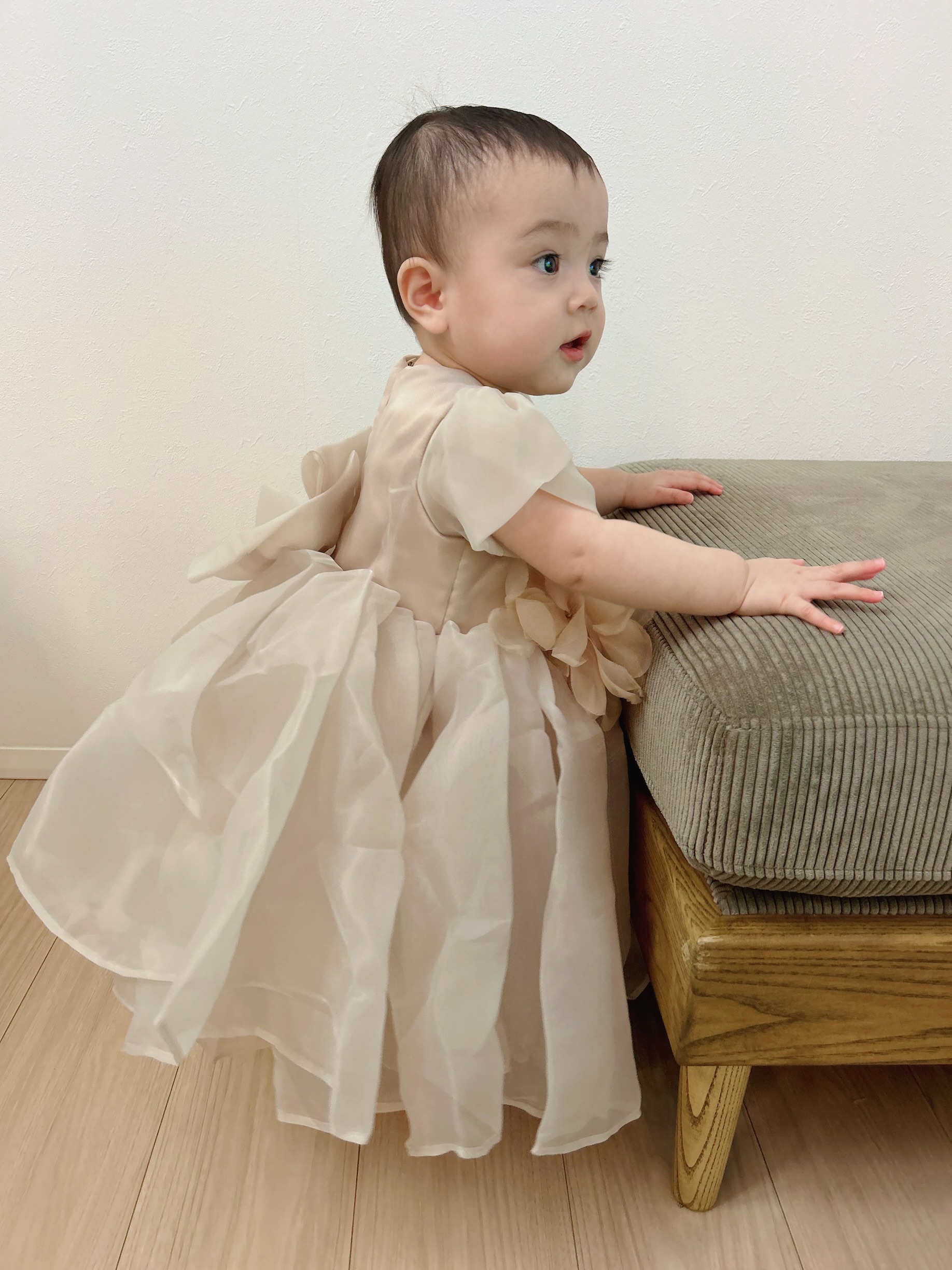 ふんわりと広がるスカートに、立体的なお花のアクセント、
