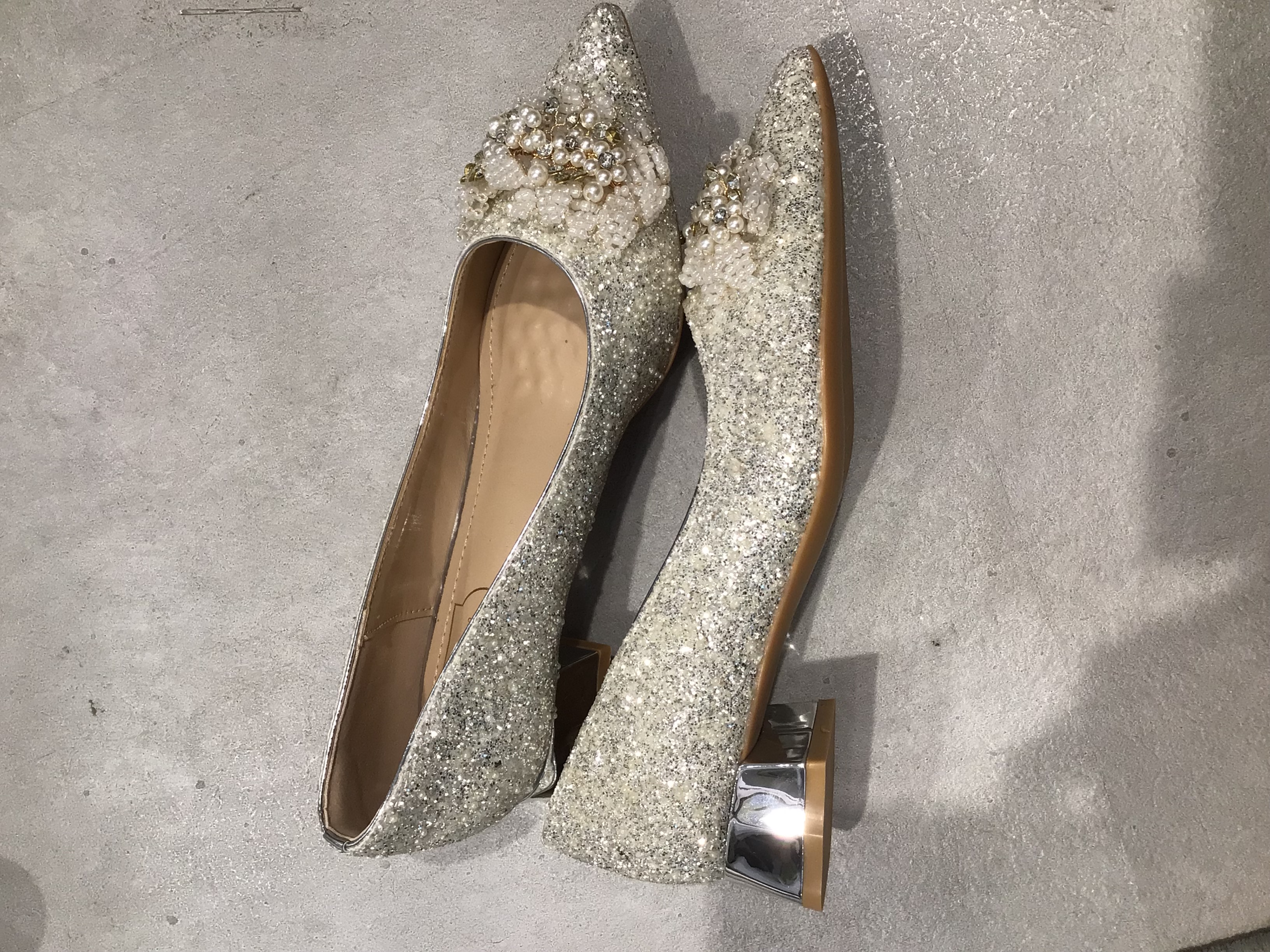 【パンプス】シルバーラメ パールビーズモチーフ 23.5 3cmヒール