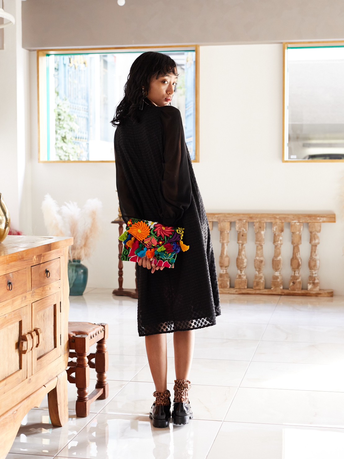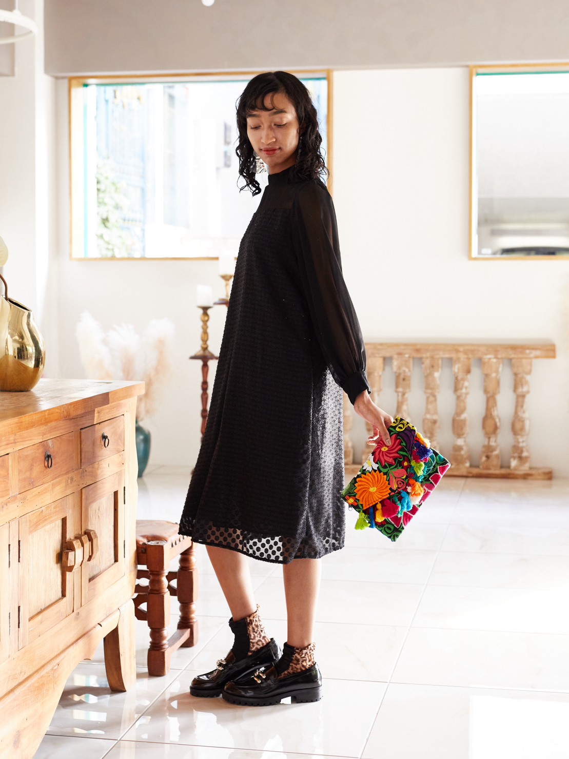 ブラック長袖ドレス。全体的にドット柄で可愛い印象です。