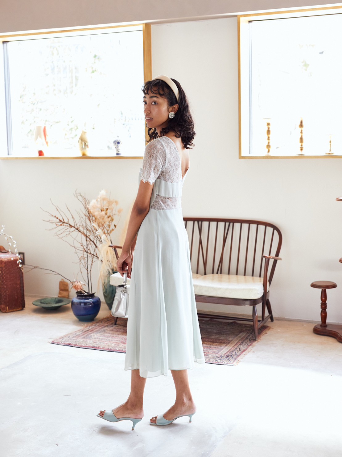上品なペールグリーン上半身レース丈長めドレス