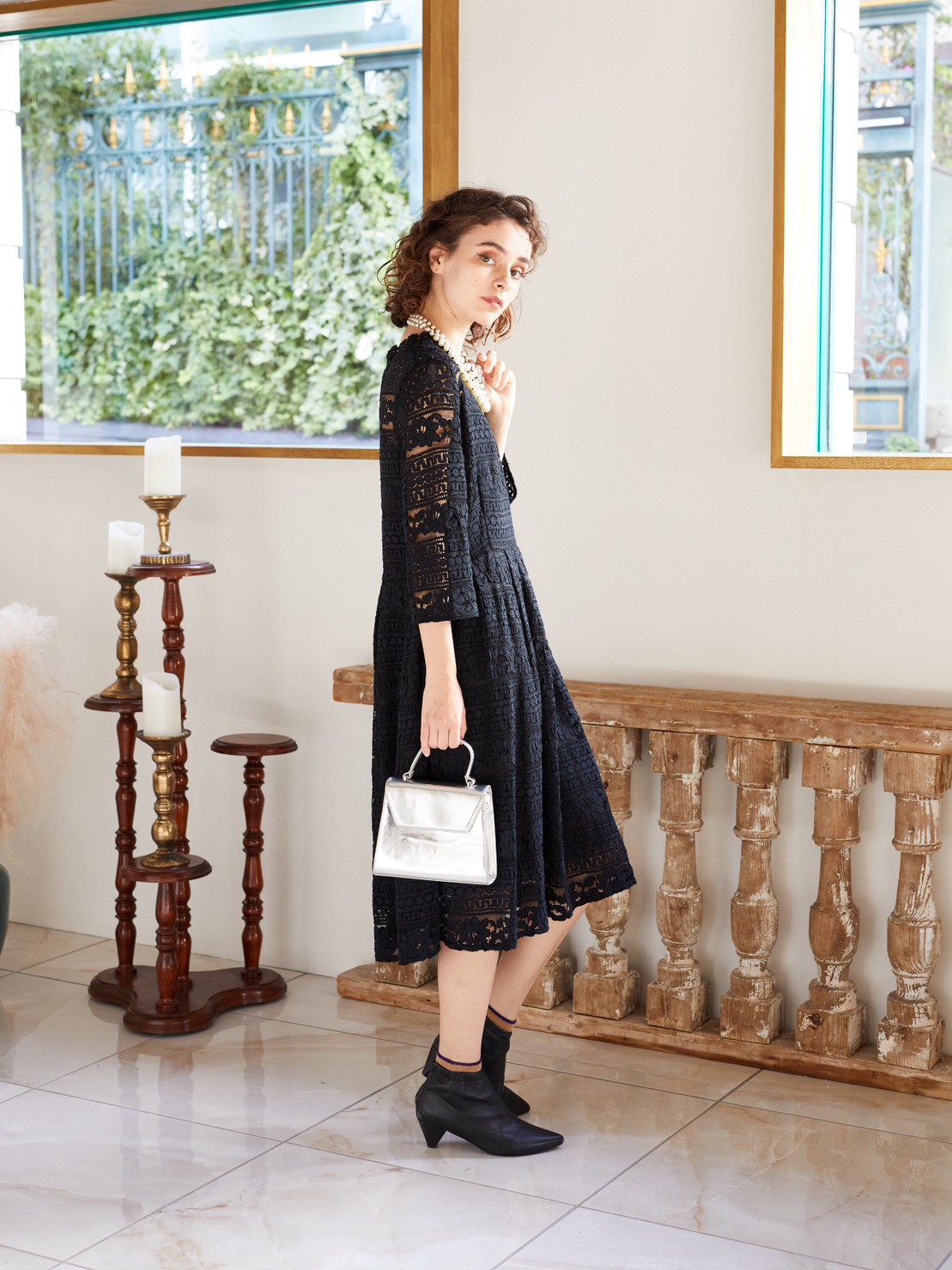 【パーティドレス】ブラック袖あり丈長め総レースドレス