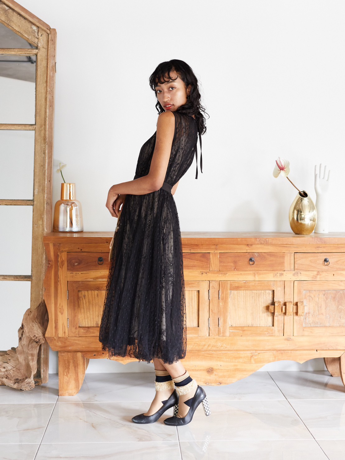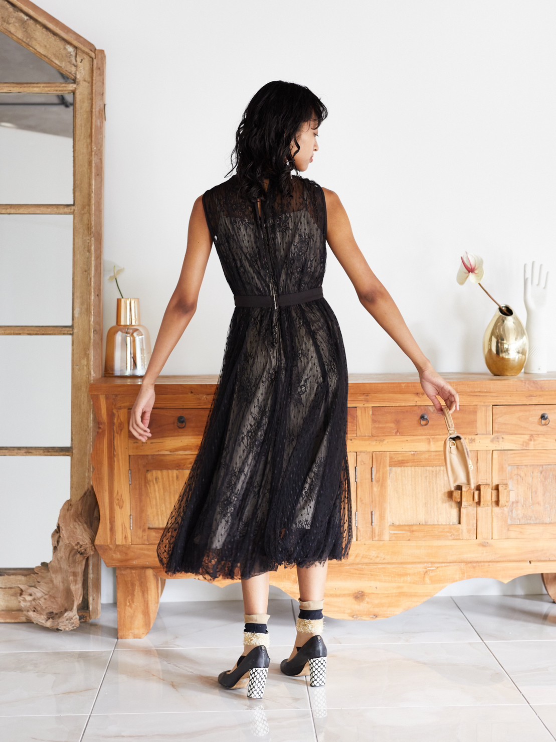 レースと水玉柄のチュールのブラックノースリーブドレス