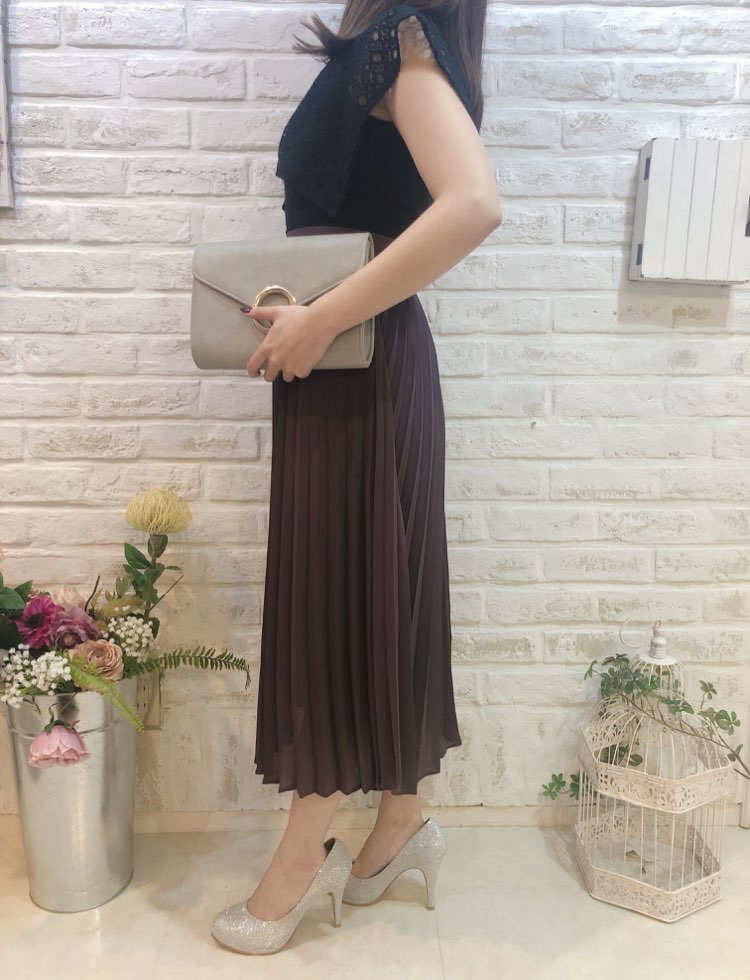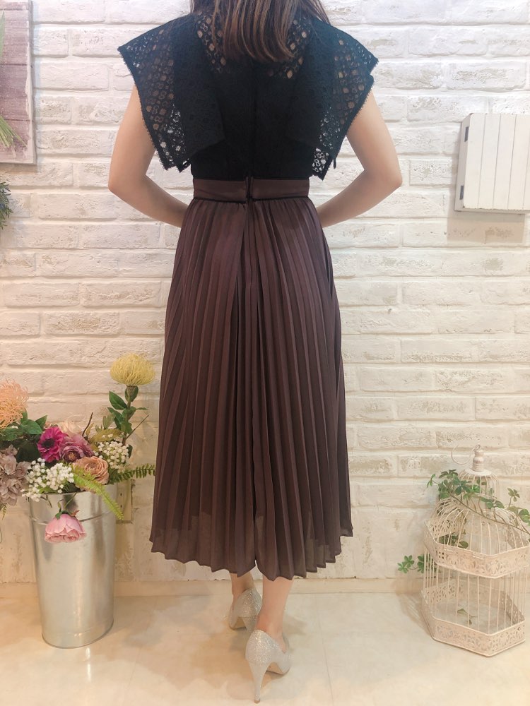 ブラックのブロックレースとバーガンディのプリーツ切り替えドレス