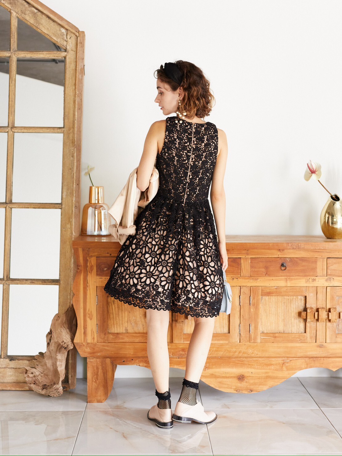 大柄フローラルの透かしレース。厚手のしっかりした生地感にフェミニンなシルエットは、派手な装飾がなくてもエレガントで華やかに仕上がり人気です。深めに開いたVネックにベーシックなブラックカラーで、大人可愛いイメージのフレアスカートドレスです。フレアスカートはウエストを締めて見せ、ヒップラインを隠してくれるのも嬉しいポイント。落ち着きのある女性らしい印象で臨みたいシーンにぴったり。結婚式参列はもちろん、おしゃれなレストランでの食事会や女子会にも。 結婚式のゲストドレスにブラックを選ぶ場合は、レース生地などの華やかに見えるものに小物などは明るい色を組み合わせるのがベター。甘さを抑えたデザインで、幅広い年齢層の方に着用いただけます。チューブトップなどのインナーをINすると胸元の露出も安心です。