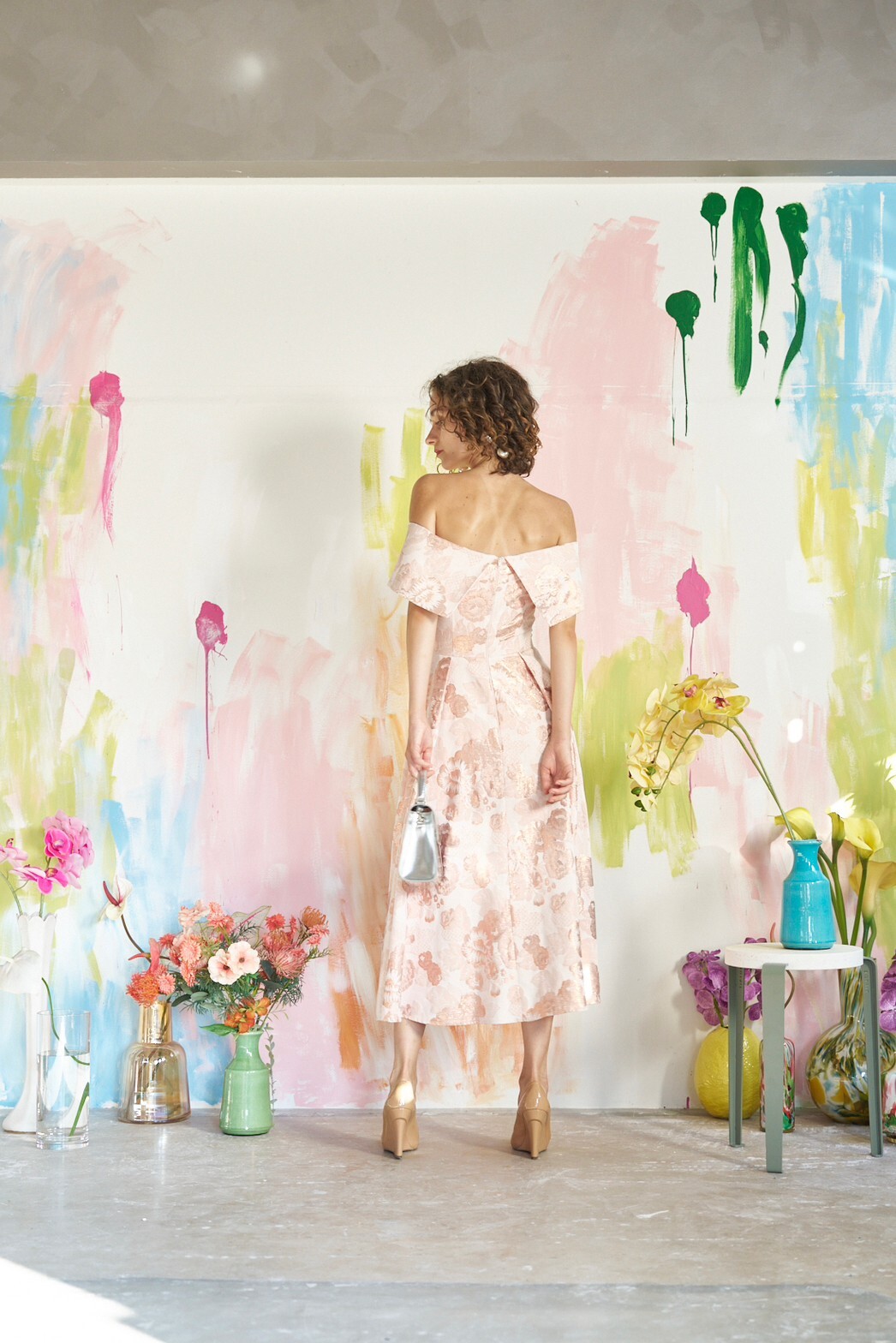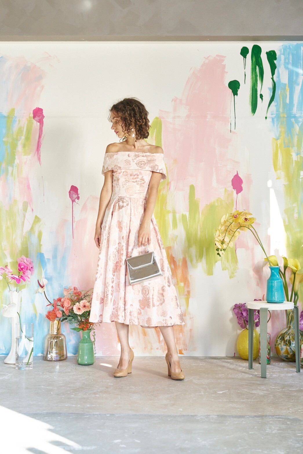 オフショルダーが女性らしいミディアムドレス。淡いピンクがとても優しい印象。ミニ丈ドレスの可愛らしさとはまた一味違った、大人っぽさ・上品さを兼ね備えた雰囲気です。リゾートパーティーや披露宴でカクテルドレス・カラードレスを着用されない新婦様の2次会用ドレスとしておすすめ。女性らしさを強調させ、顔周りをスッキリ見せてくれるデコルテデザインが特徴のオフショルダーは、羽織らずドレス1枚で着用いただくとドレス本来のスタイリッシュで主役感のある華やかさを楽しめます。ネックレスなしで大ぶりのイヤーアクセだと抜け感のあるナチュラルスタイルに、ネックレスをつけると甘くプリンセスのようなスタイルに。ドレスインナーのご用意があると安心です。
