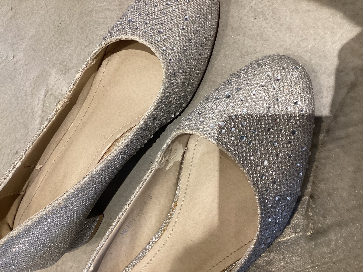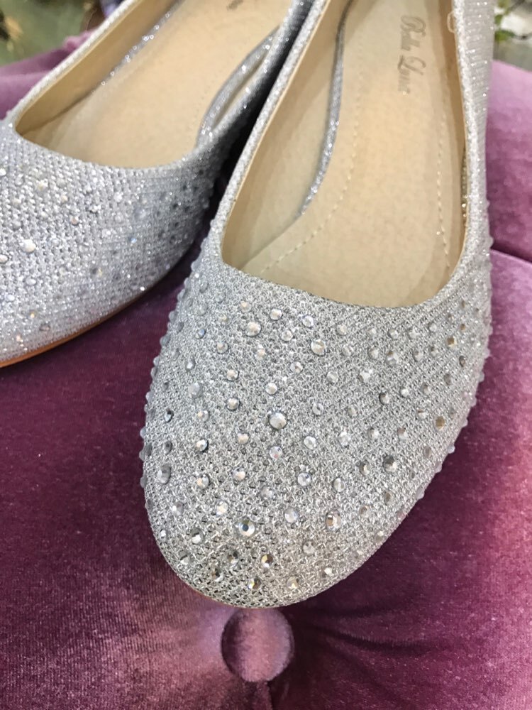 キラキラと華やかなシルバーのローヒールパンプス。5cm以上のヒールが苦手な方や妊婦さんにも安心して履いていただける太めの4cmヒール。履いた感じは限りなくフラットに近い感覚で安定感抜群。マタニティや高身長で高さを出したくない新婦様の1.5次会、2次会用のウエディングシューズとしてはもちろん、高いヒールは避けたいけれど、お呼ばれなどのマナー上ペタンコを履くのも・・・という場合に重宝するアイテムです。ラメの煌めきが華やかな生地のつま先には同系色のラインストーンをちりばめた、結婚式やパーティーなどの特別な日にぴったりの贅沢なデザインで、幅広いドレスとコーディネート可能なお色味です。