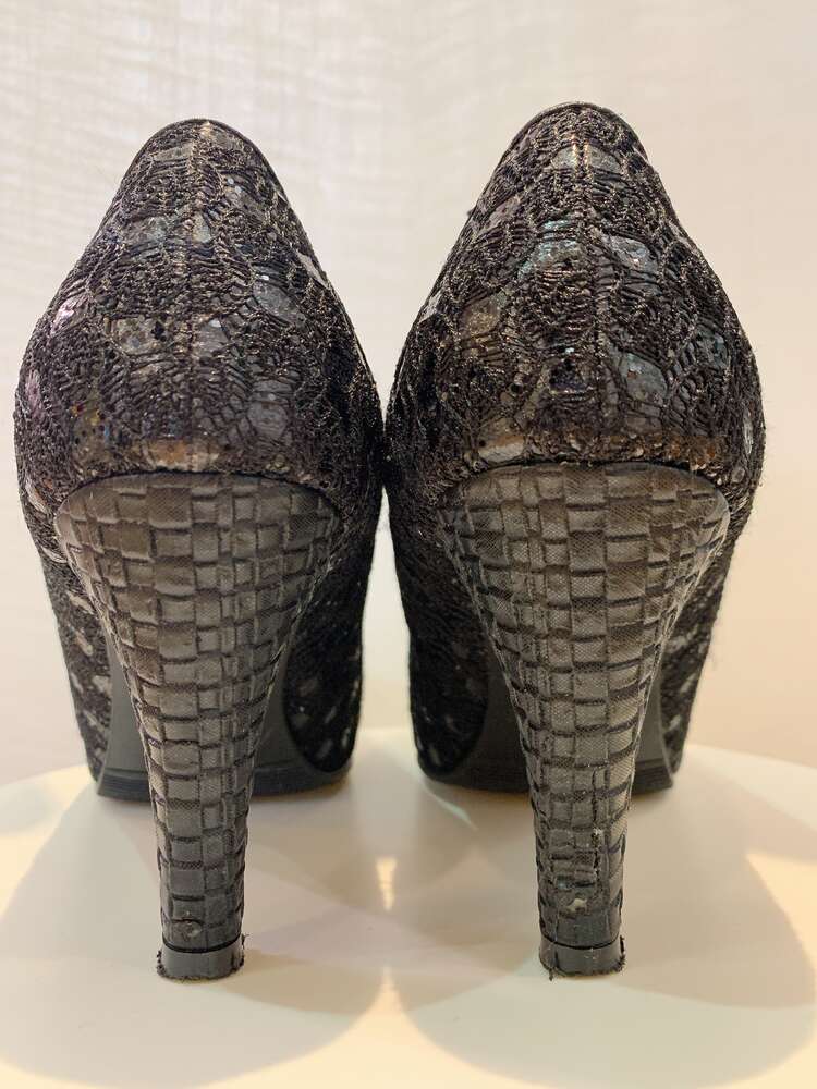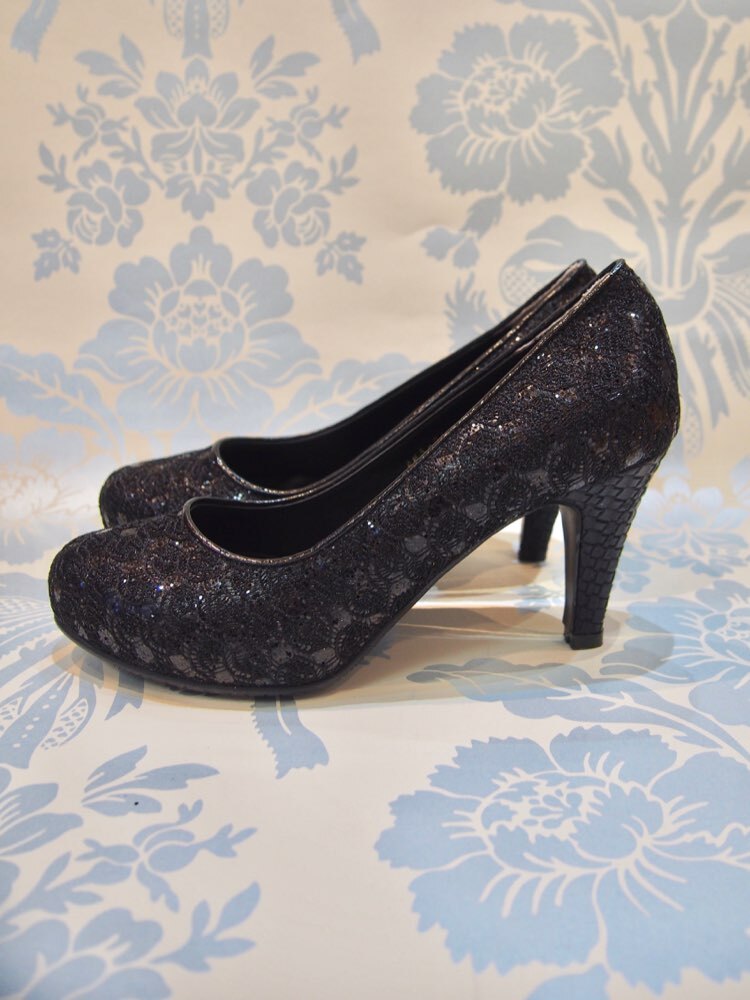 丸みのあるフォルムがフェミニンで使いやすいブラックカラーのパンプス。レース生地の間にびっしりと埋め込まれたホログラムがキラキラと煌めき、普段よりも特別感のあるスタイリングへとブラッシュアップさせてくれます。シンプルなデザインであらゆるタイプのドレスに合わせやすく、重厚感を感じる厚手の生地と程よいボリュームは足元だけでなくコーディネート全体にメリハリを与え引き締めて見せてくれます。明るく優しいカラーのドレスの締め色や大人っぽくかっこいいドレスをさらにかっこよく仕上げるアイテムとして、結婚式のお呼ばれから同窓会や謝恩会まで、靴選びに迷った際にはチャレンジしやすい一足です。