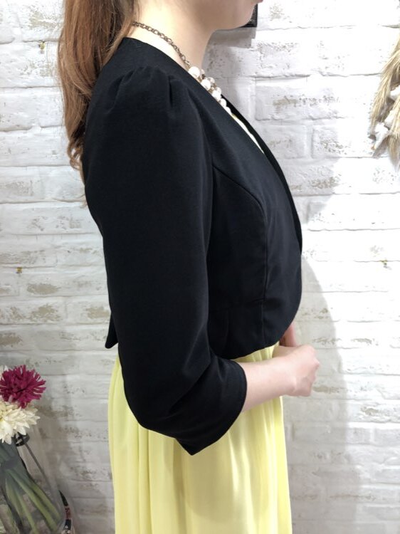 ブラックカラーの7分袖ジャケット。フォーマルなスタイルにおすすめの1点です。7分袖ですっきりとした印象に。裏地がレースになっているのでお袖を折り返してレースを見せても素敵です。光沢感のないマットなブラックカラー。L表記ですが7号~11号位の方でしたら着用して頂けます。(※正面バスト辺りの生地がクリーニングにより外側に開き気味になっております。)結婚式参列、各種パーティ、お呼ばれ、お食事会など様々なシーンにプラスして頂ける商品です。サイズは目安になりますので必ず表記している実寸サイズをご確認ください。