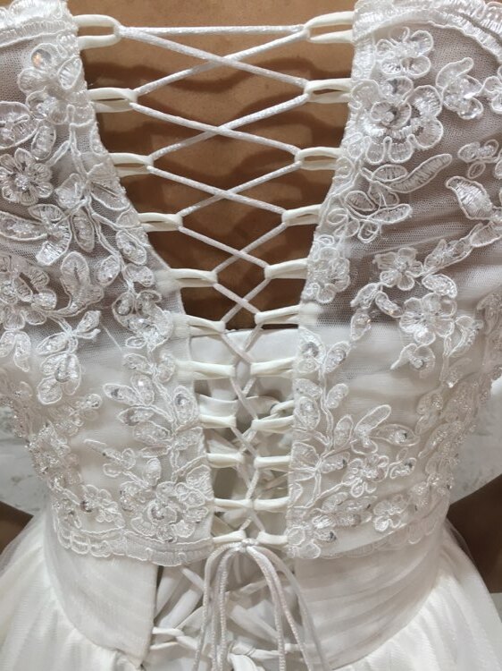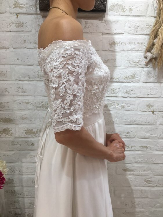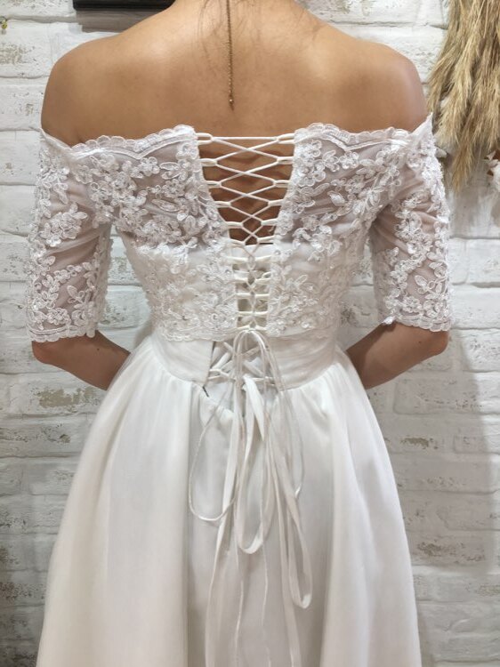 花嫁様におすすめのホワイトウェディングボレロです。背中部分はあみあげタイプ。交互に紐を結んで頂くタイプです。ホワイトカラーのシンプルめなベアドレスの上に羽織るだけでドレスの雰囲気をがらりと変えることが可能です。腕を露出されたくない方にもおすすめです。オフショルダーデザインで二の腕辺りにすべり止めのゴムが付いております。細身のデザインで普段5号〜7号位の方におすすめです。サイズは目安になりますので必ず表記している実寸サイズをご確認ください。