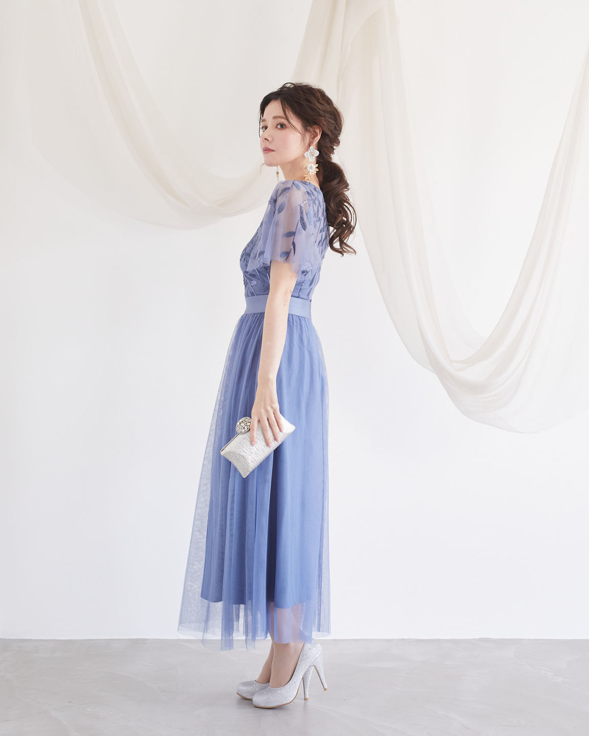 くすみブルーが可愛いショートスリーブのロングドレス。全体的にチュール素材なので。ふんわりと可愛い柔らかい印象に。胸元のスパンコールのリーフ柄模様がおしゃれです。演奏会、パーティー、様々なシーンでご利用頂けます。