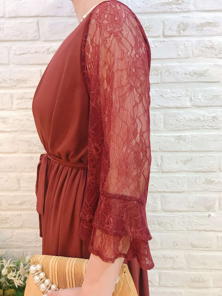 ゲスト様におすすめなレンガカラー袖レース丈長めドレス