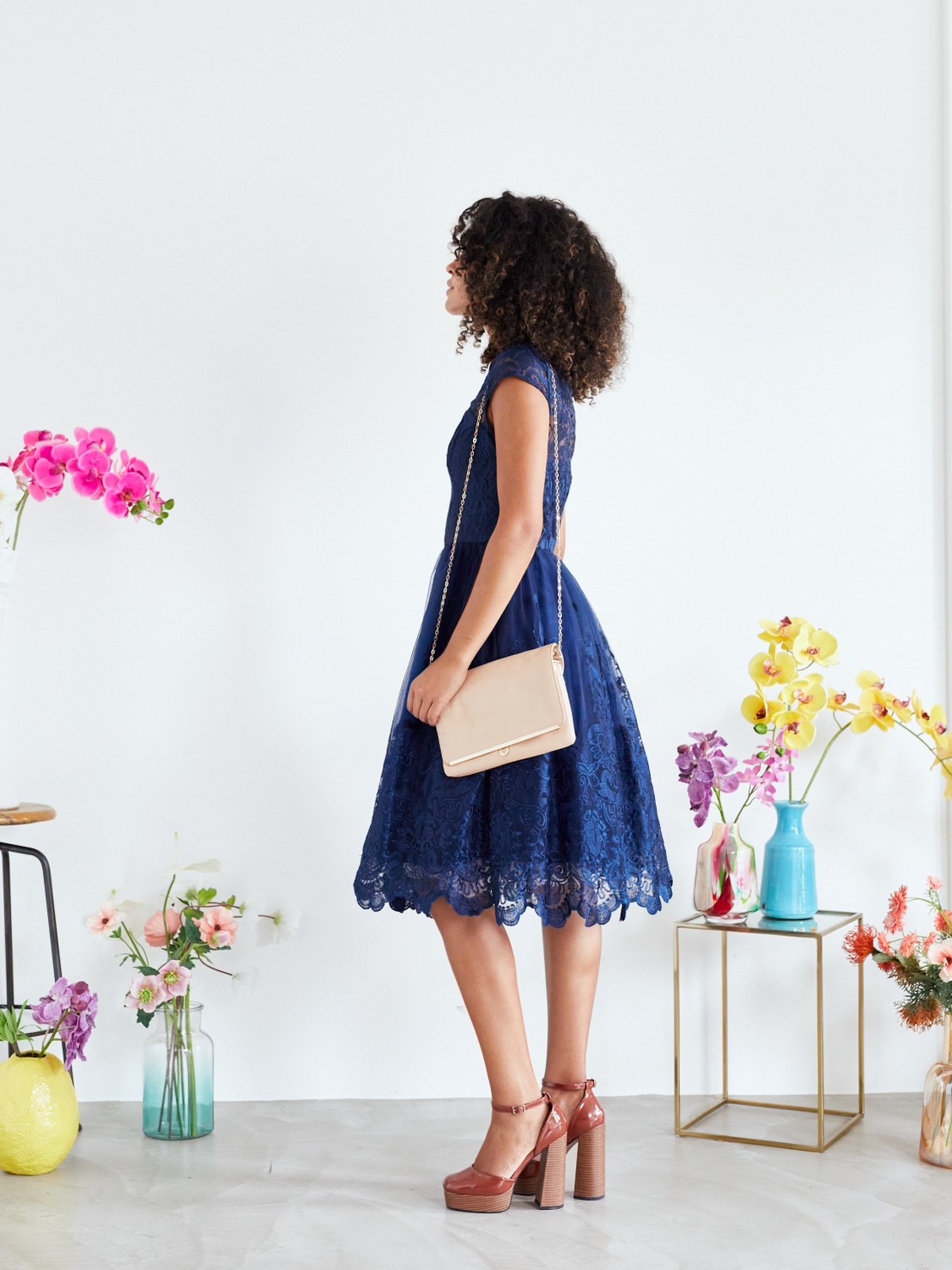 【パーティドレス】ネイビー総レースふんわり袖ありドレス