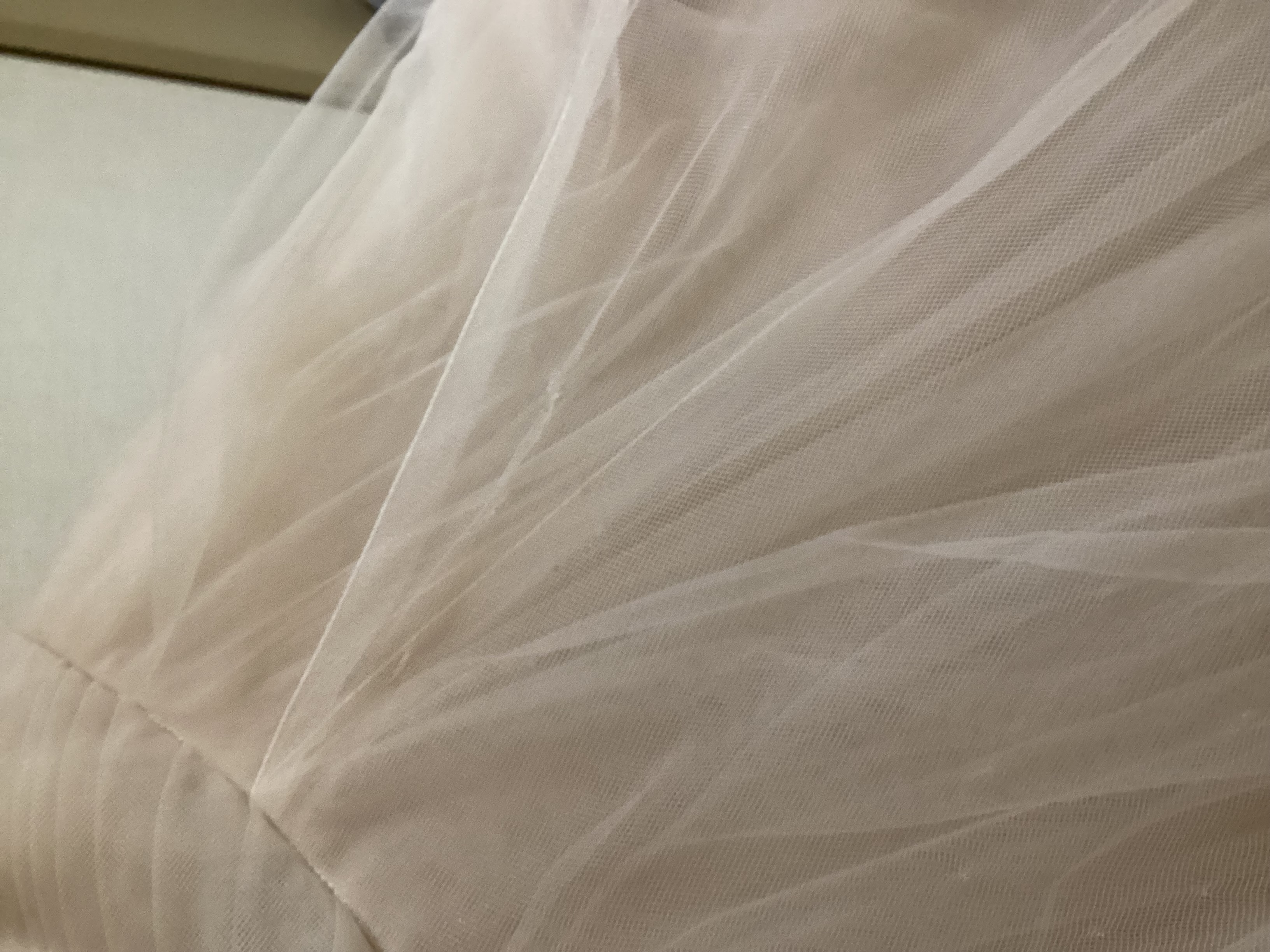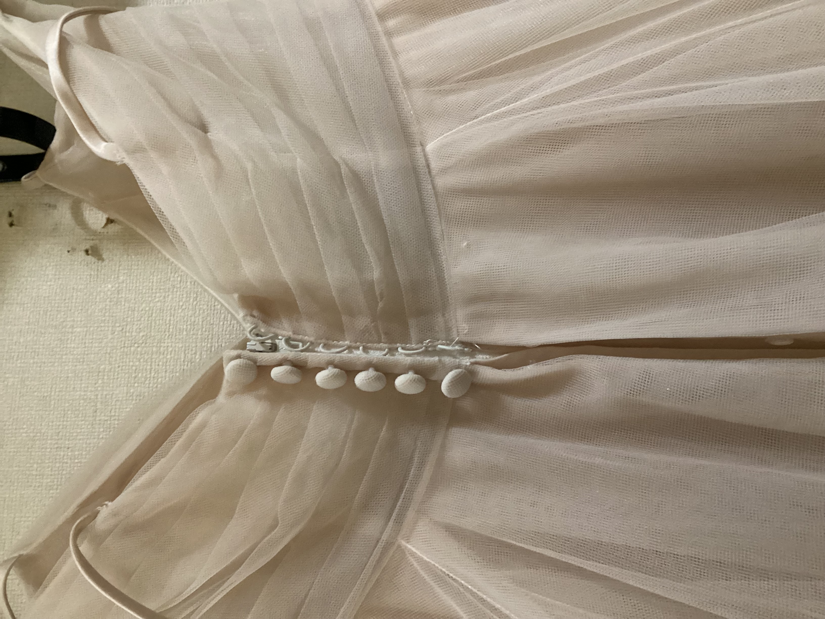 背中ファスナー付近チュール穴数箇所、正面左ウエストチュール穴ほつれ修復履歴あり