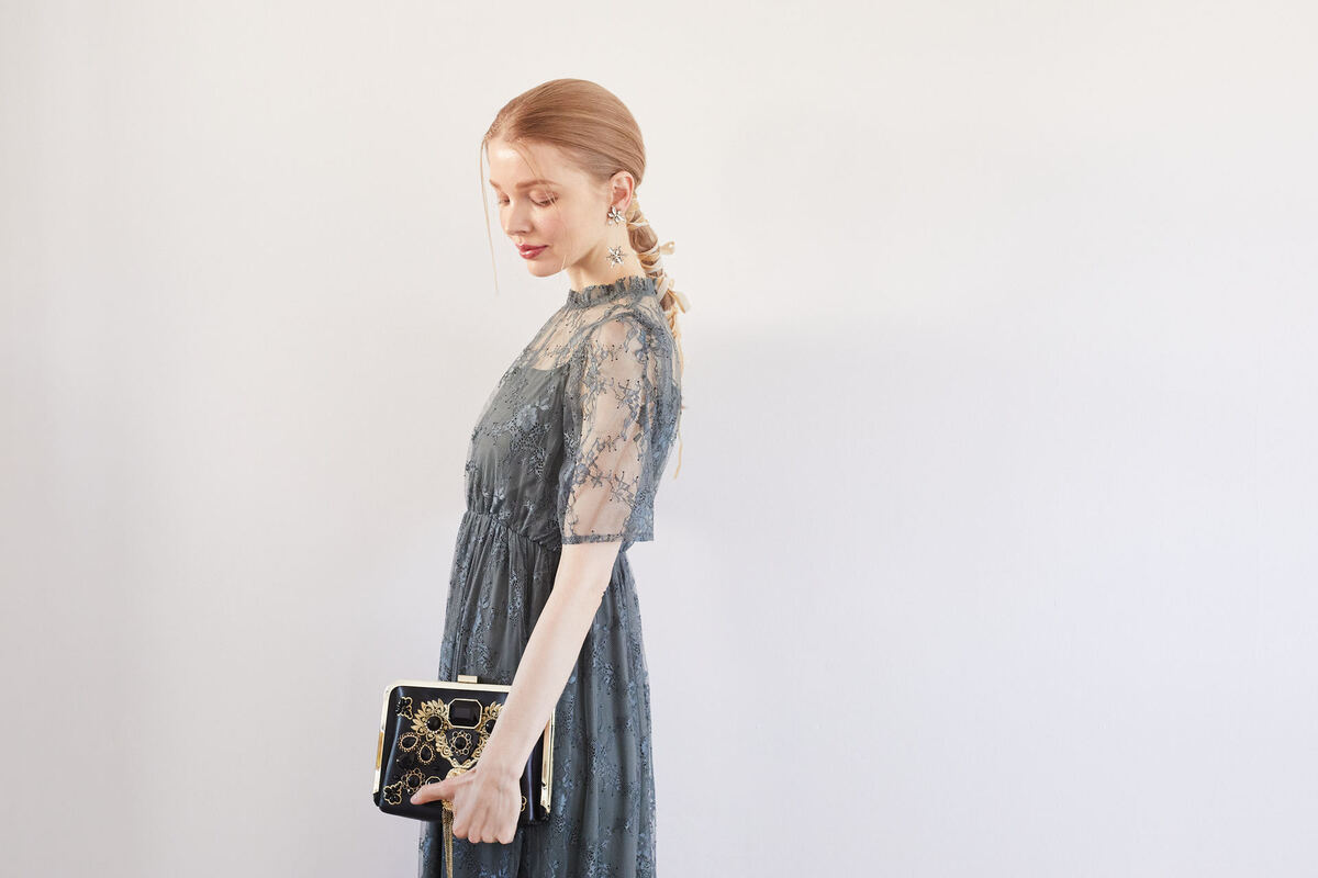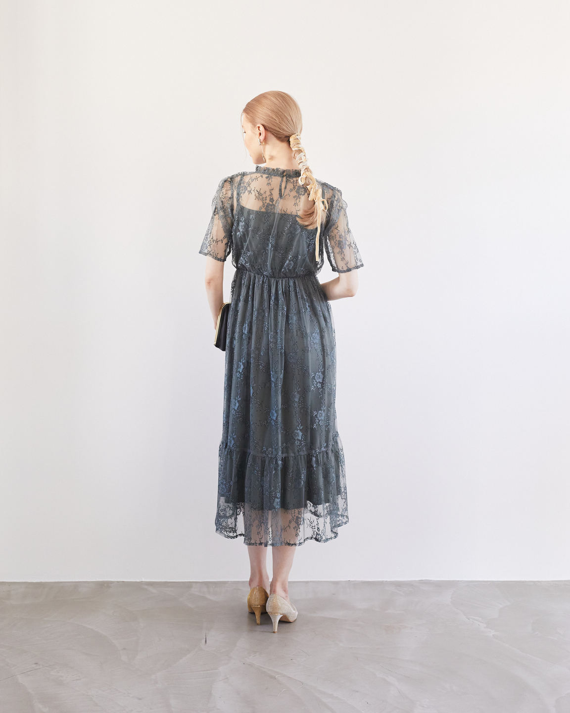 スモークダークグリーン ゲストドレス 半袖総レース レンタル