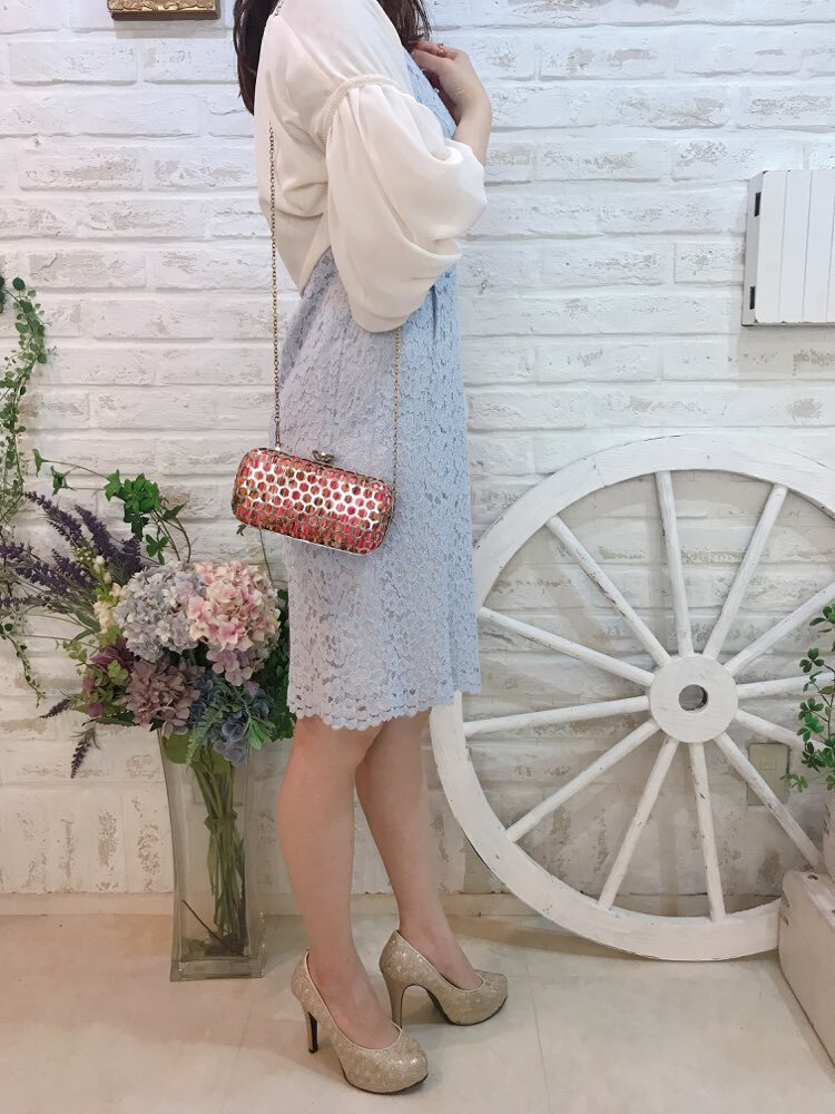 ゴールドの網目模様のミニクラッチバッグ。網目の下地にはピンクとオレンジの斑柄となっています。チェーン付きの2way仕様なので、利用シーンによって持ち方を替えられるのも嬉しいポイントです。結婚式や二次会、各種パーティなど華やかな場面にぴったりなバッグです。