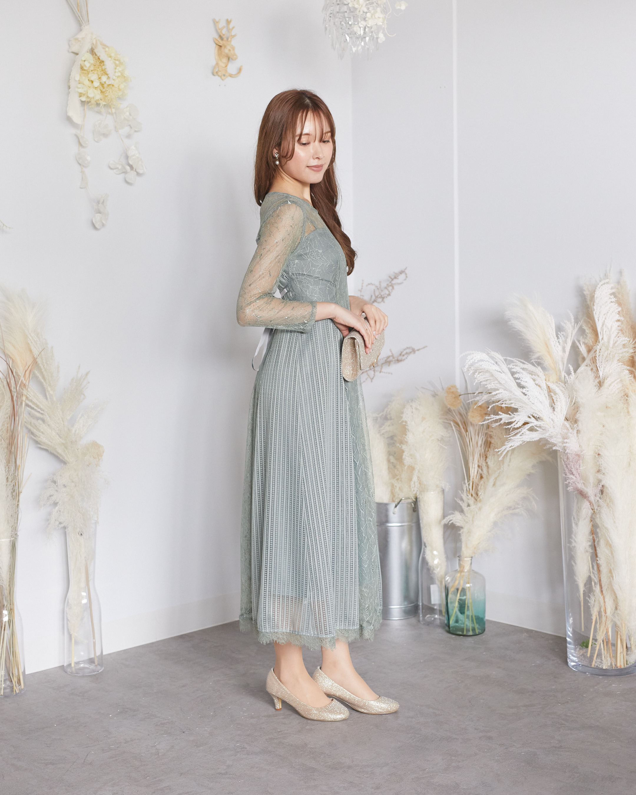 くすみグリーン ロングスリーブ 総レース ゲストドレス レンタル 安い