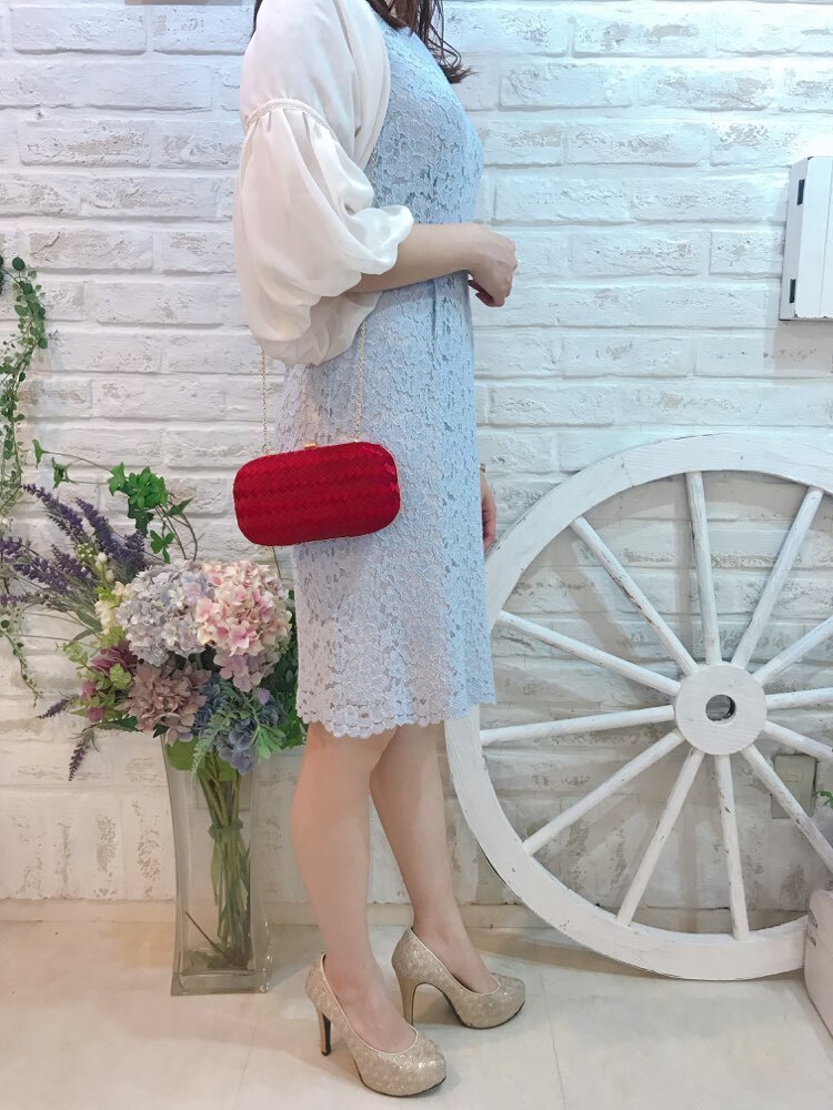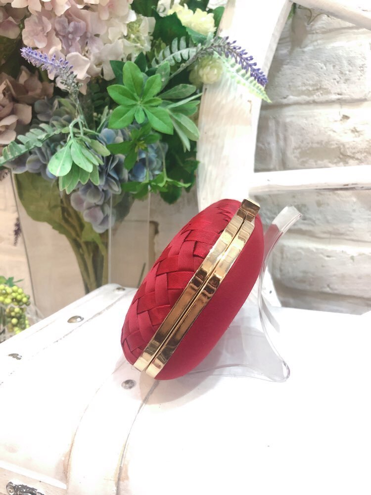 レッドのミニクラッチバッグ。幾何学模様にサテン生地を合わたデザインとなっていておしゃれなミニバッグです。チェーン付きの2way仕様なので、利用シーンによって持ち方を替えられるのも嬉しいポイントです。袱紗が入る大きさで、収納力もあり抜群の機能性。結婚式や二次会、各種パーティなど華やかな場面にぴったりなバッグです。