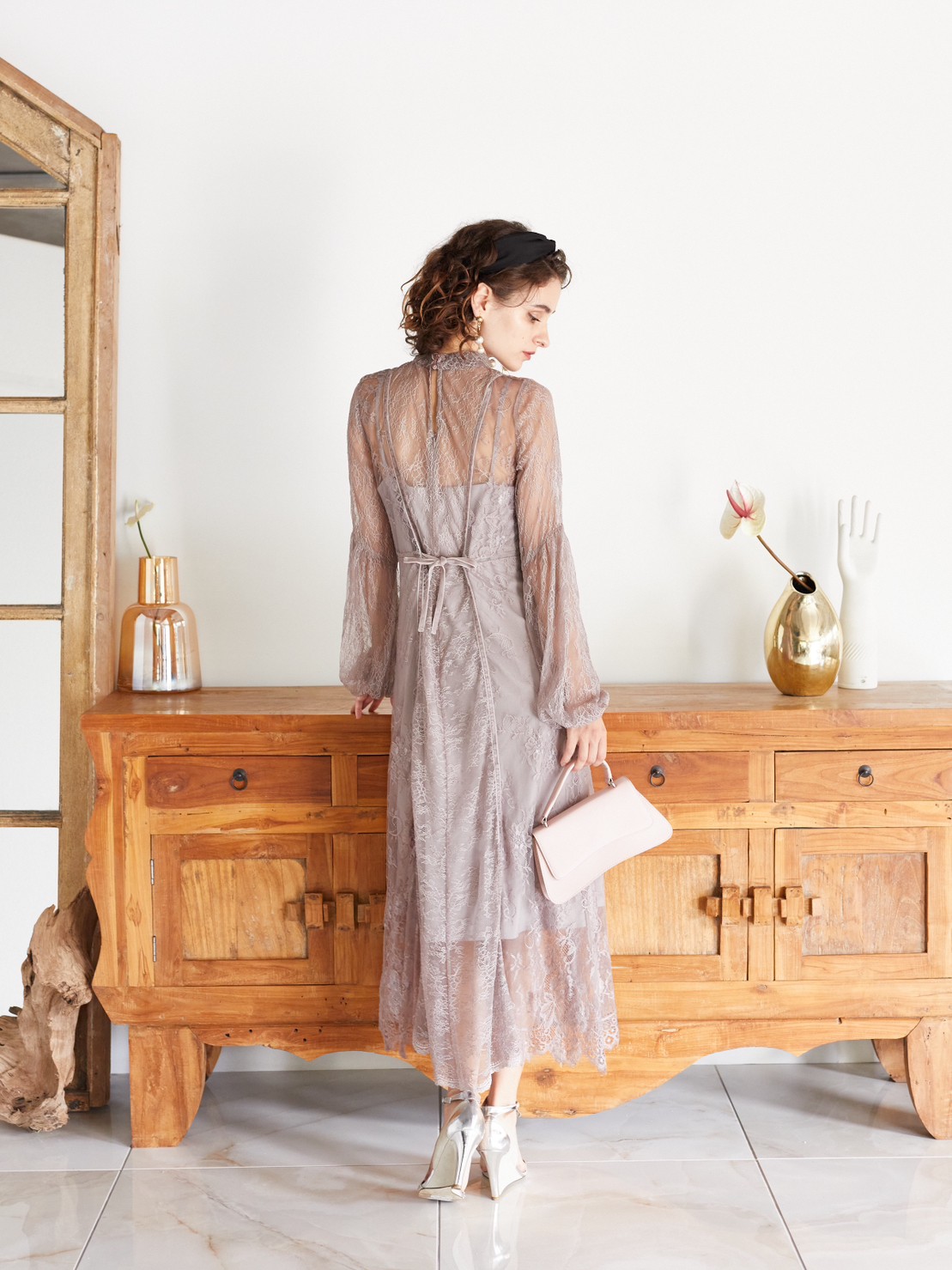FRAY I.Dドレス フレイアイディードレス 表参道レンタルドレス パーティードレスも スモーキーパープルカラー総レースドルマンスリーブドレス S-M