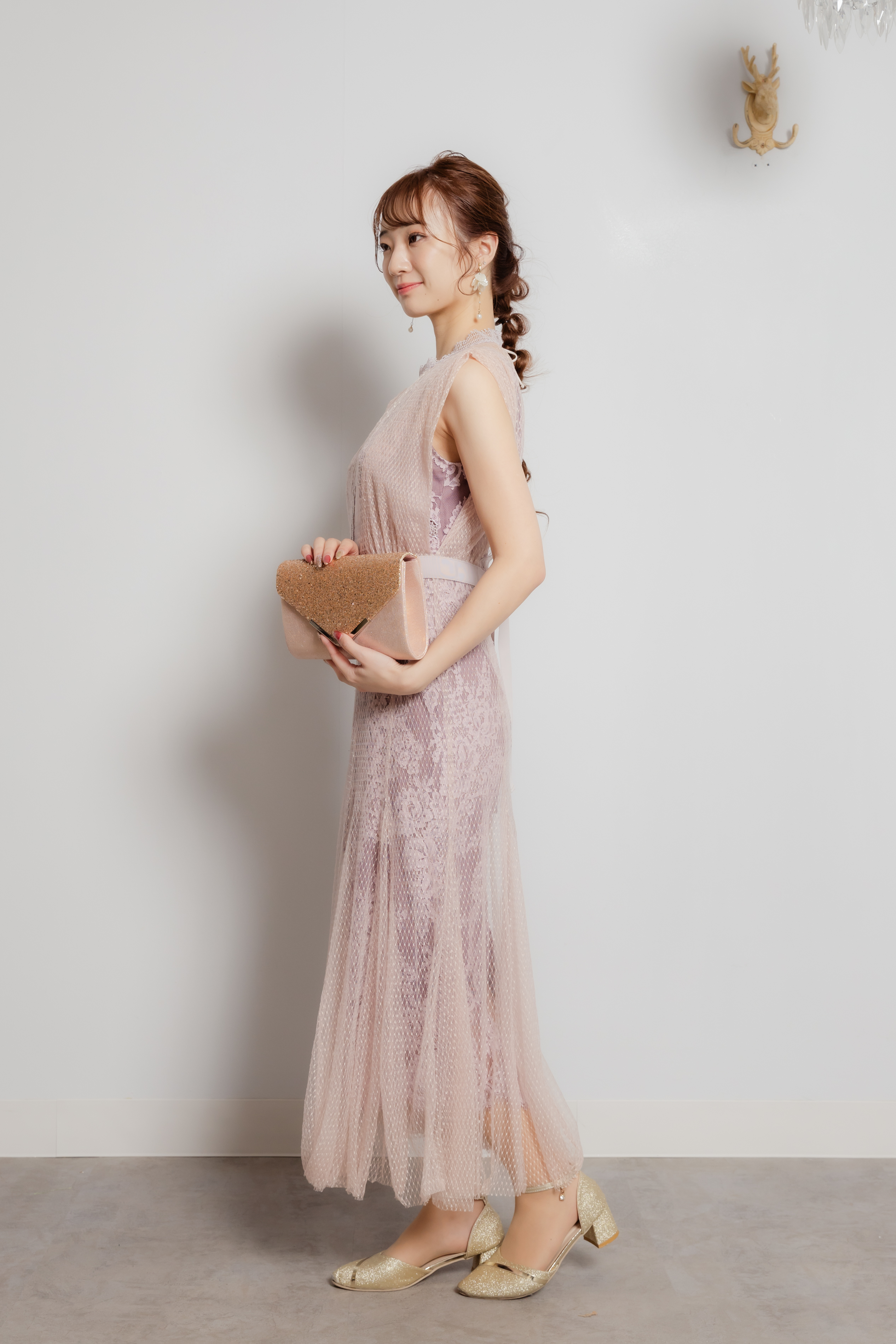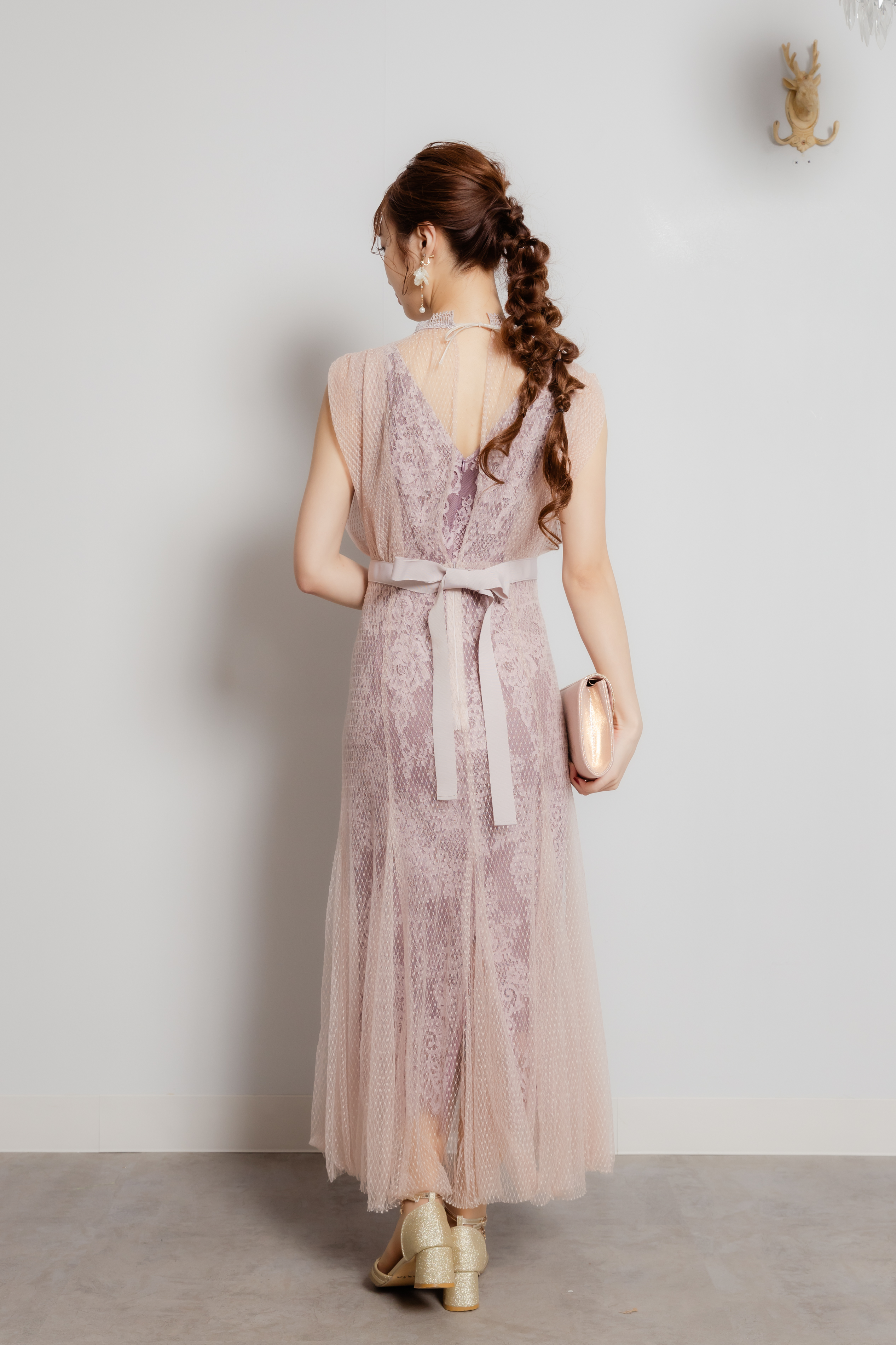 ダスティピンクあずき色内側総レースドレスドットチュールオーバードレス付ドレスXS-S