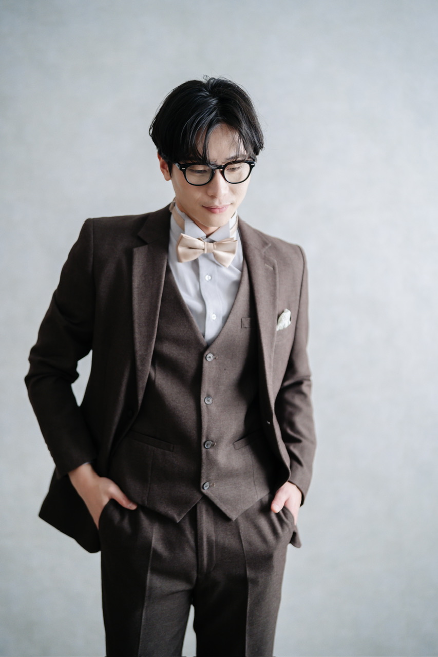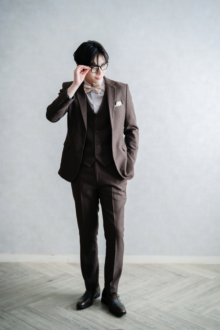 深みのあるブラウンに光沢を抑えた落ち着いた色合いは、新郎としての特別感を演出するのはもちろん、ゲスト用としても着こなしやすいのが魅力です。ジャケット・ベスト・パンツを揃えたフォーマルなセットアップで、披露宴や二次会でも活躍。シンプルでクラシックなシルエットは写真映えし、幅広いシーンに対応できる一着。華やかさと上品さを兼ね備えたフォーマルスーツをお探しの方におすすめです。