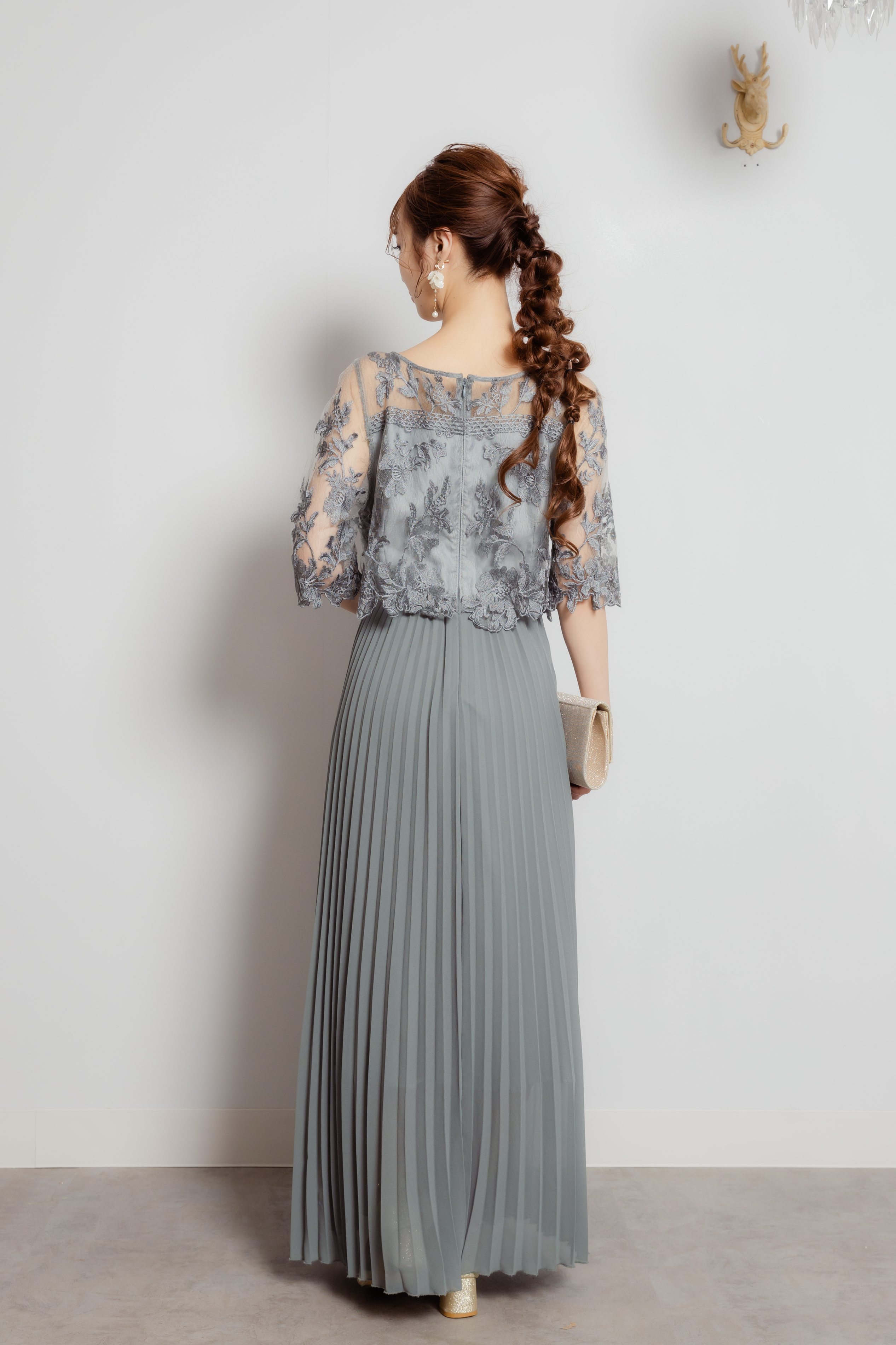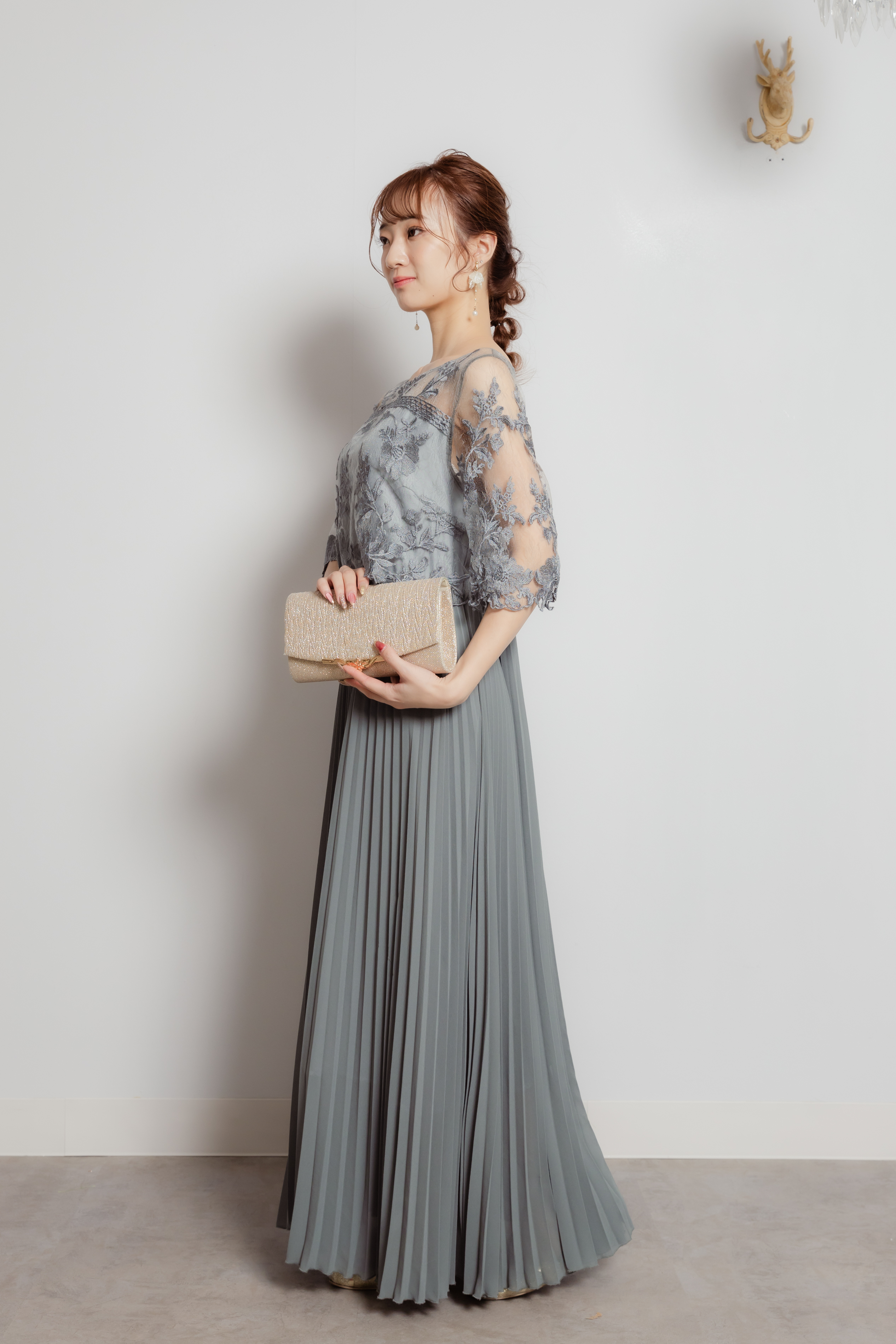 ライトカーキ レーススリーブ×プリーツスカート切替ロングドレス 3L
