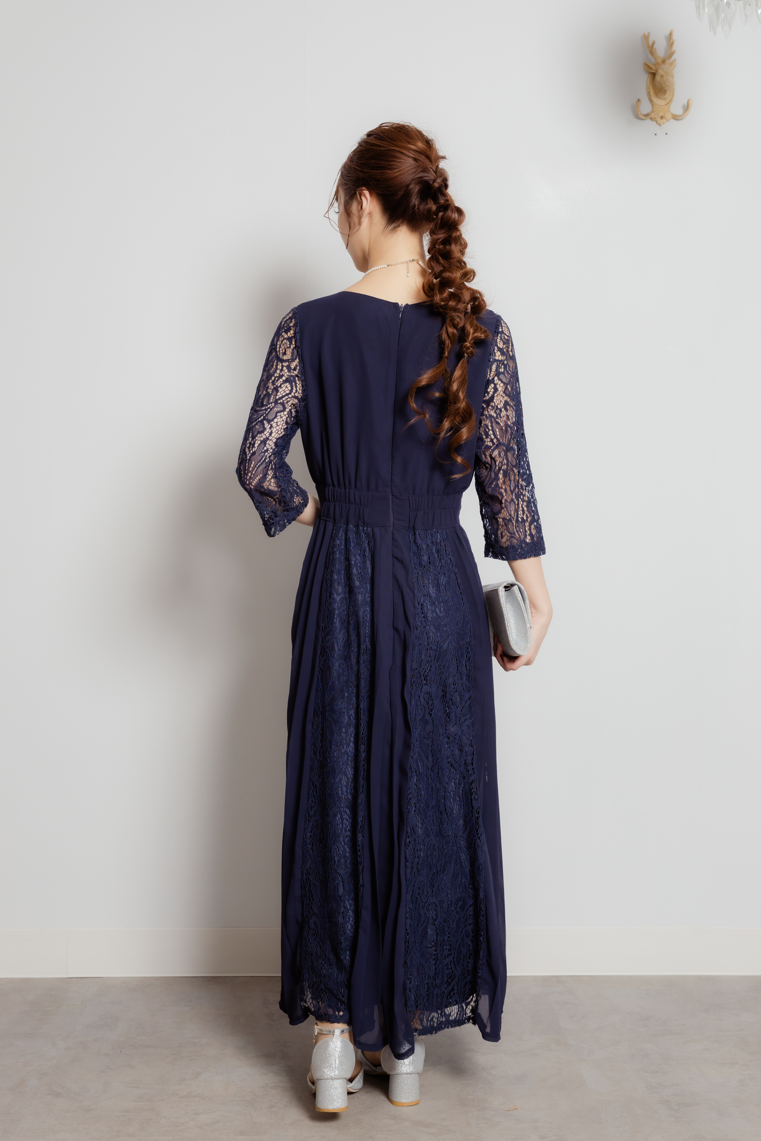 ネイビー袖レース×プリーツスカート切替ドレス2L