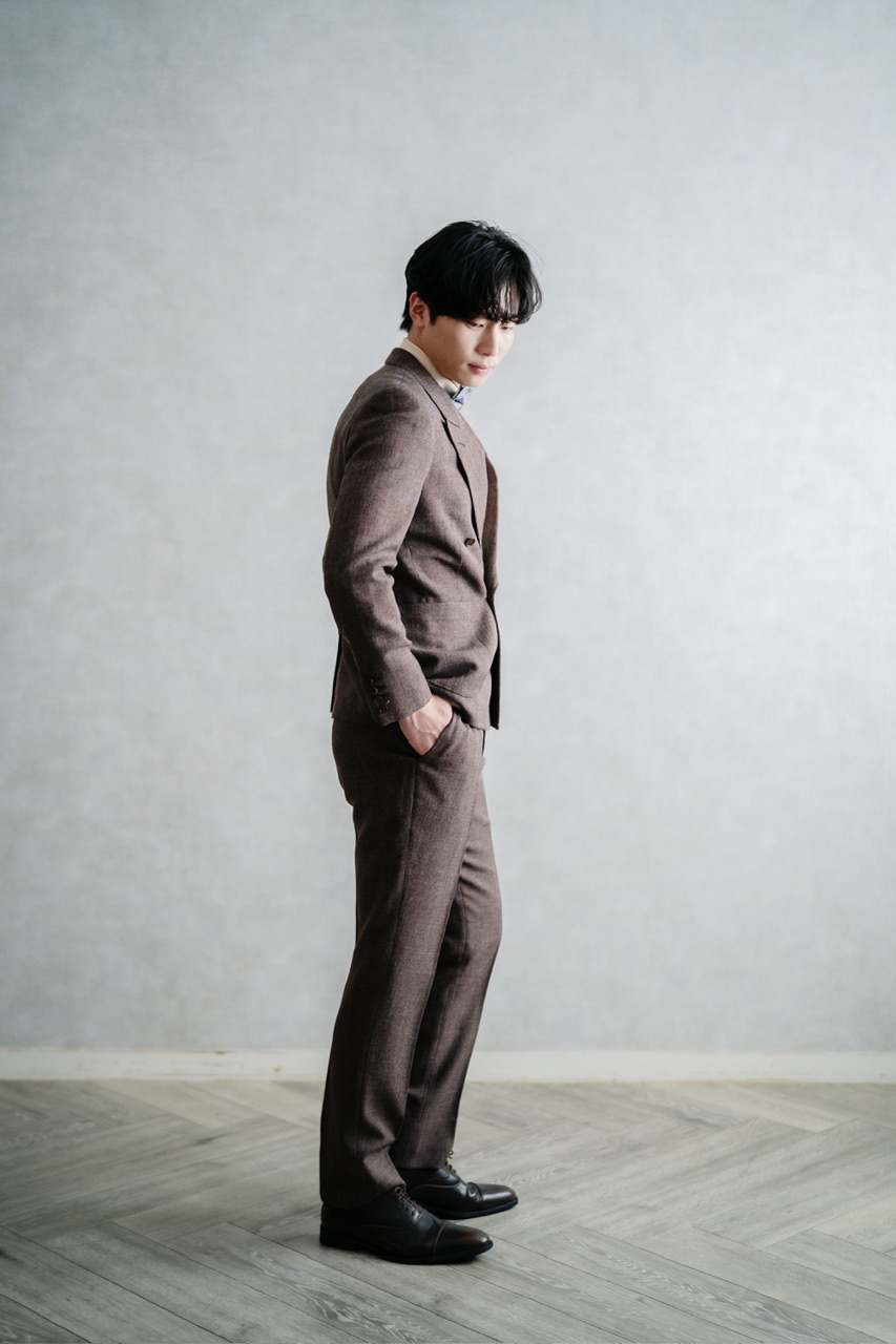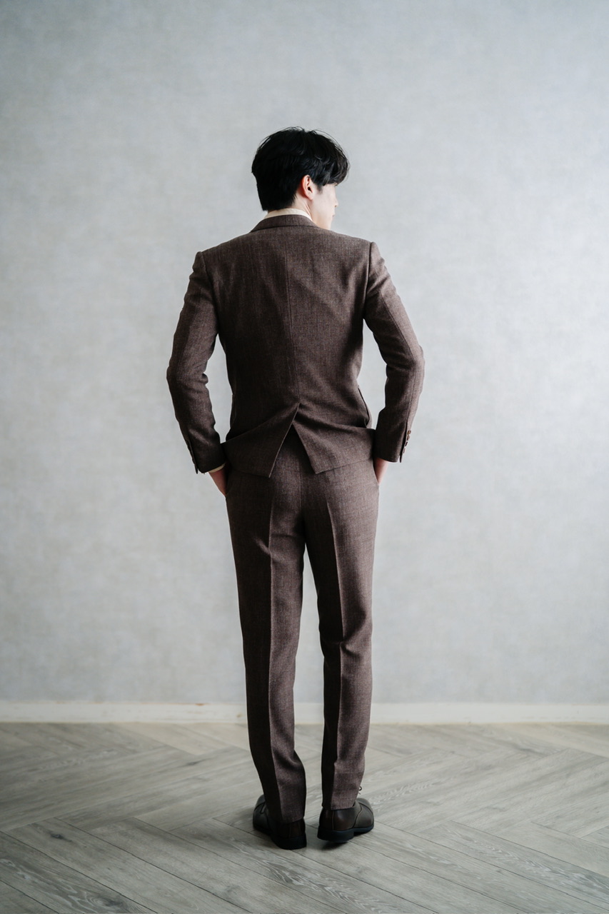 人気のダブルジャケットでおしゃれに、ボタンの色はこだわりのブラウンで仕上げました。