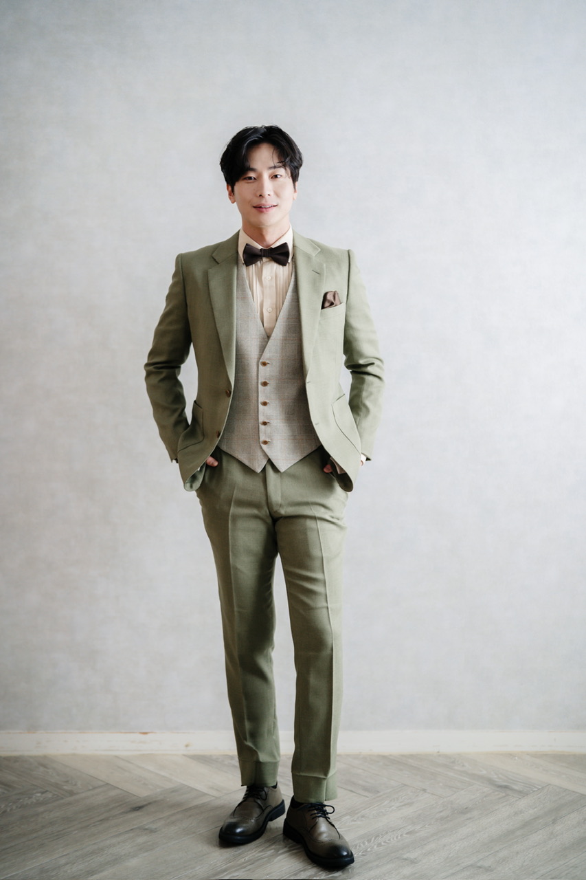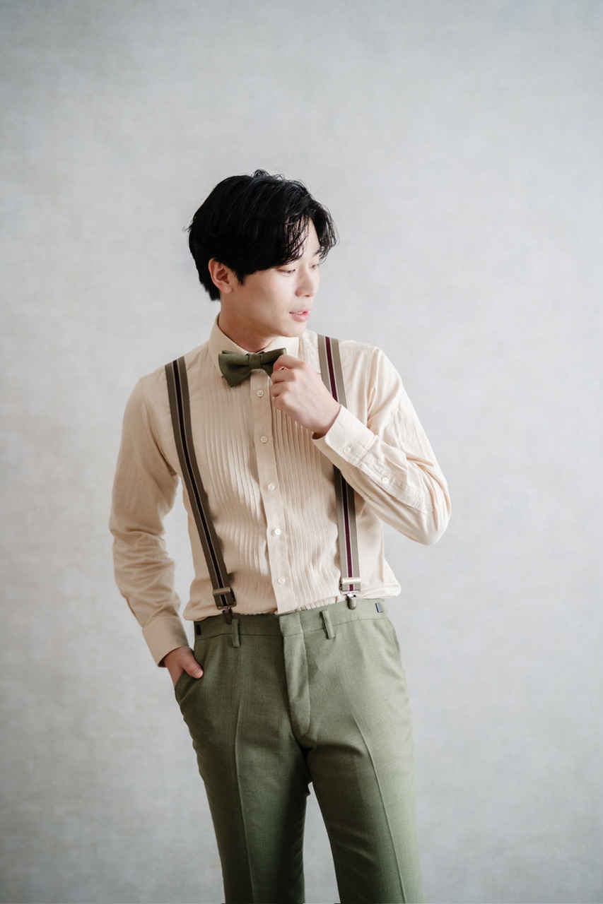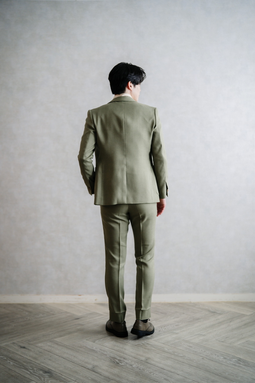 結婚式や前撮りにおすすめの新郎用セージグリーンスリーピースタキシード。ナチュラルな色合いはガーデンやリゾートウェディングにも相性抜群で、柔らかく優しい雰囲気を演出します。ジャケット・パンツ・ベストの正統派3ピース仕様に加え、ベストはグリーンとベージュチェックのリバーシブルデザイン。クラシックにもカジュアルにもスタイルを変えることができ、披露宴や二次会、前撮りフォトなどシーンに合わせて印象を自在にアレンジできます。シンプルながら個性を引き立てる、写真映えする一着です。