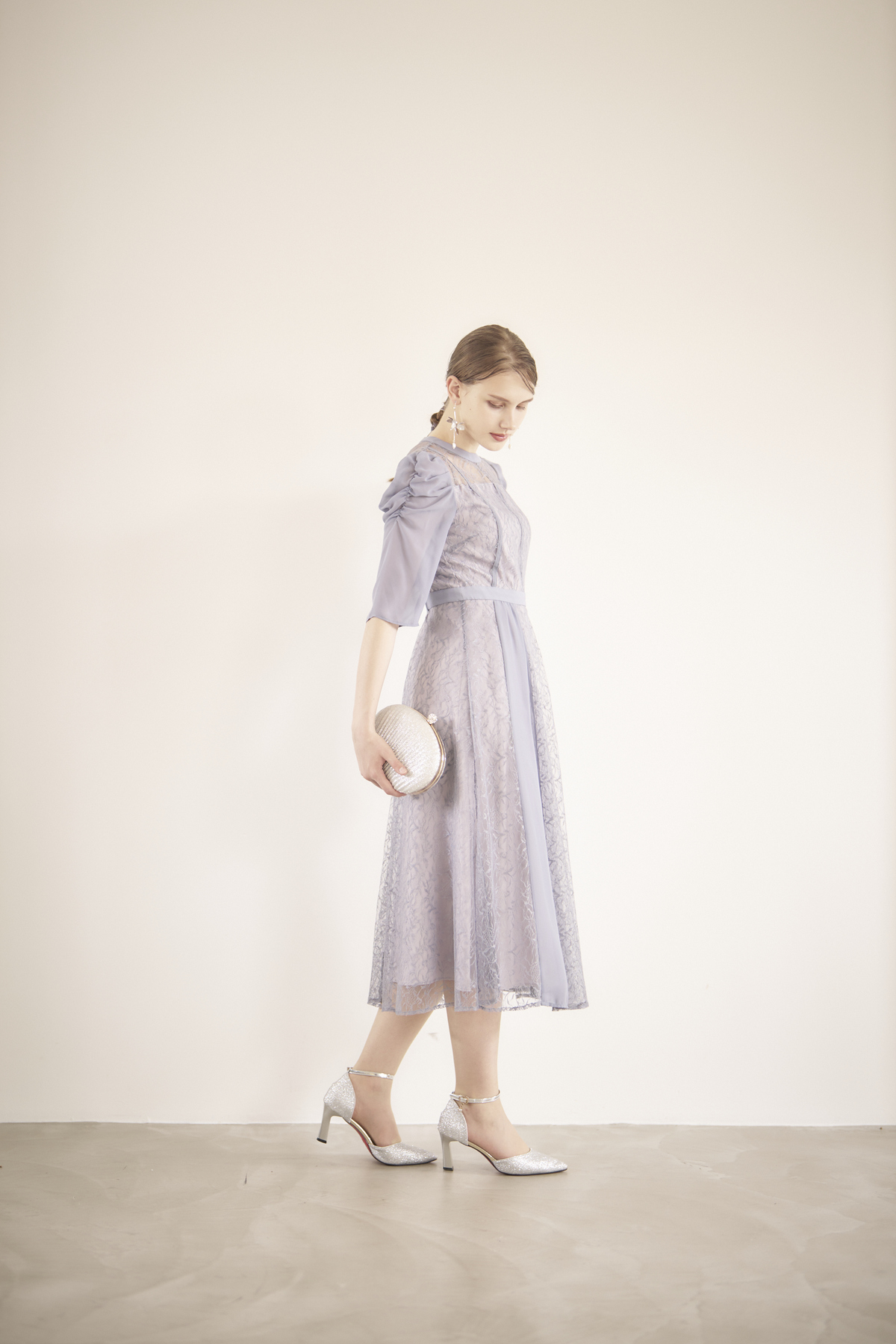 上品なブルーグレーのカラーと繊細なレースが縦ラインで入っていて、スッキリとした印象に